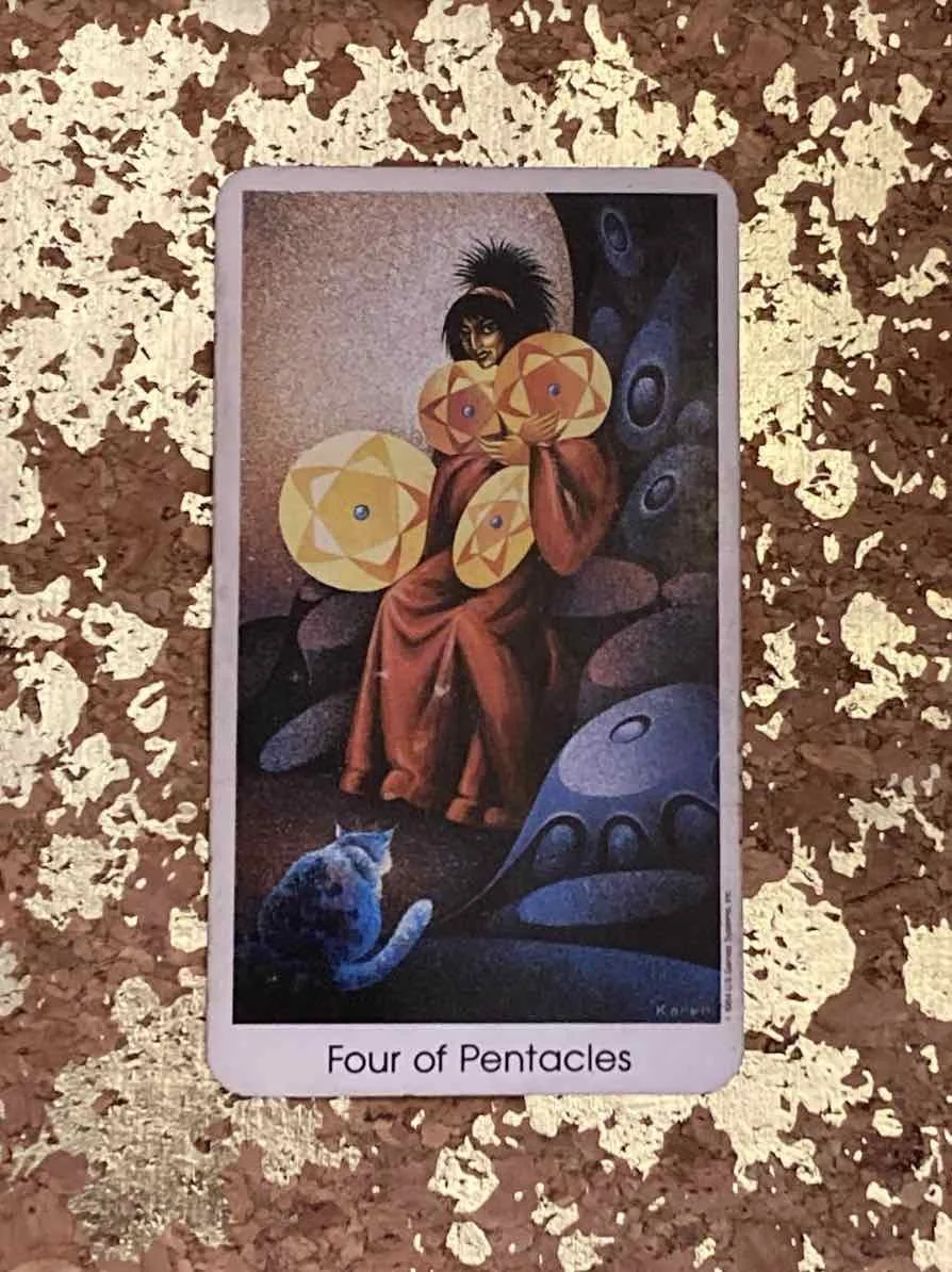The Four of Pentacles from the Tarot of the Cat People by Karen Kuykendall. Photo Credit: Mary Ann Caputolan