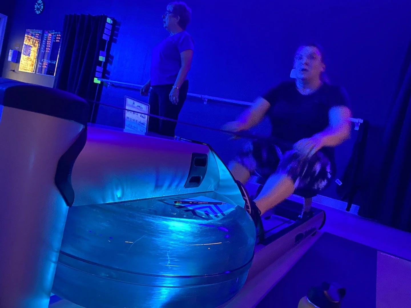 Black lights have turned the room a dark hue of purple as bright colors pop and rowing machines whir.