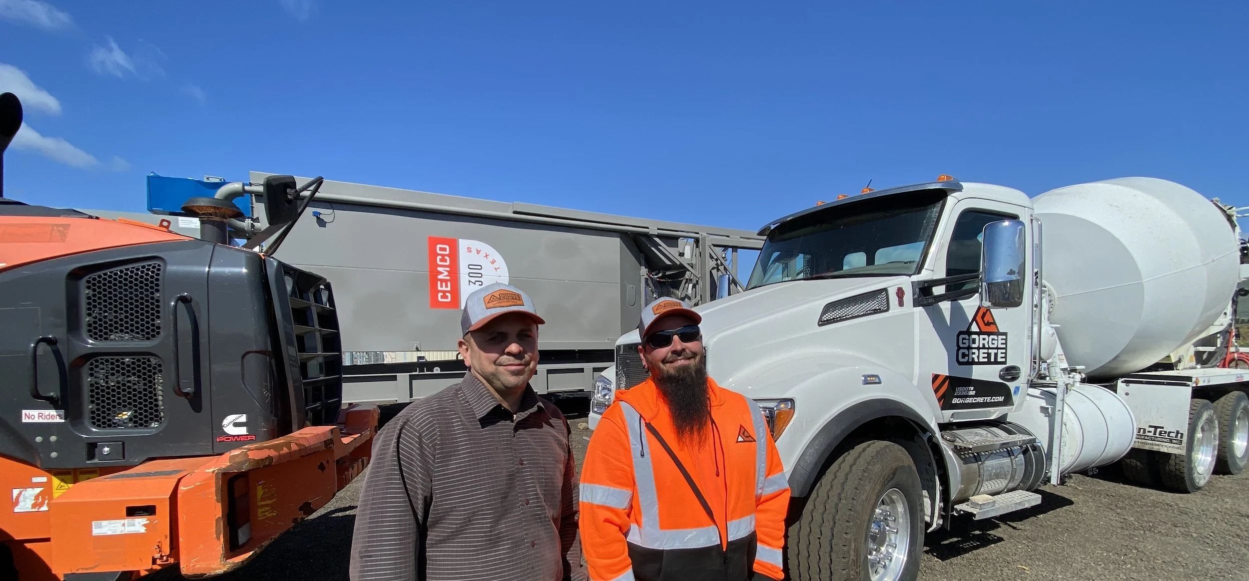Bob Breshears and James Parmiter are quite happy with their state-of-the-art equipment as they prepare to deliver concrete all over the Gorge. The company has five standard concrete trucks and has two front loaders coming in soon to access all jobs.