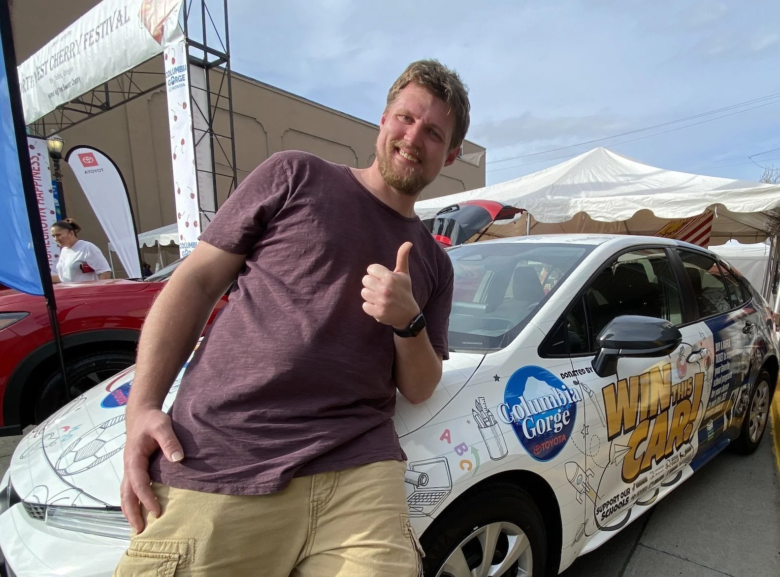 Last Spring 2023- The Dalles High School Music Teacher Mic Kelly was all thumbs up as students sold tickets at Cherry Fest in TD to win this 2023 Toyota Corolla. The students were a bit camera shy, but Mic pulled it off with a solid thumb move. Thanks Mic! Columbia Gorge Toyota provided the new vehicle for the raffle that raised tens of thousands of dollars for high school activities in The Dalles and Hood River.
