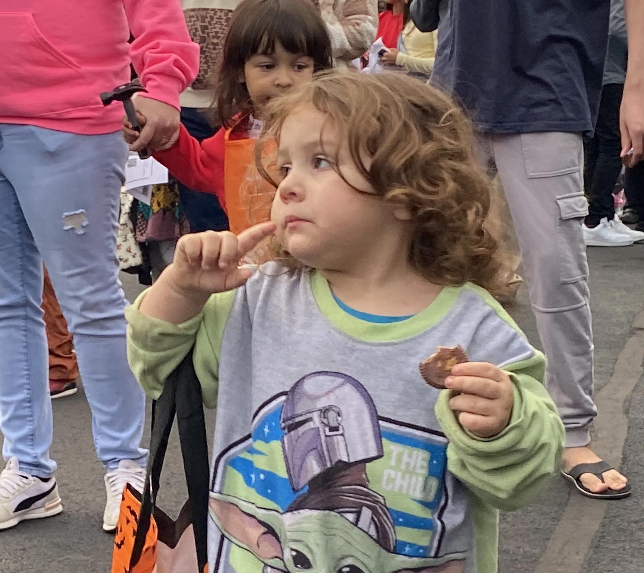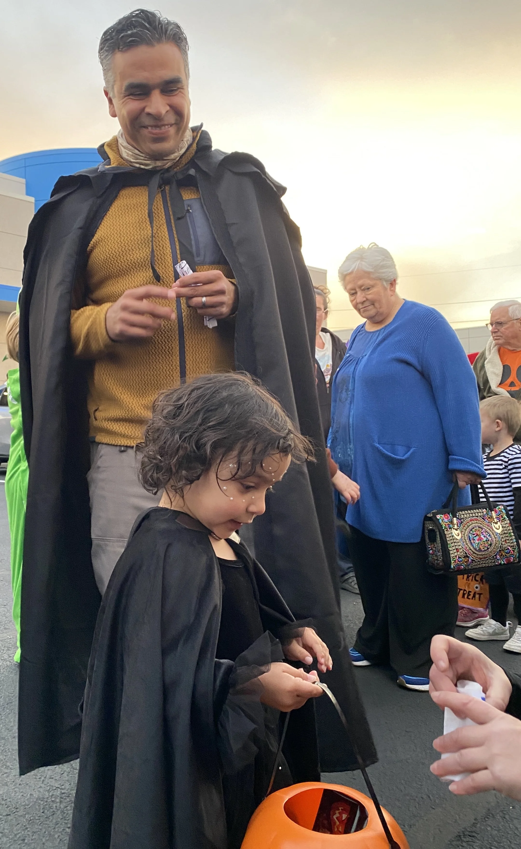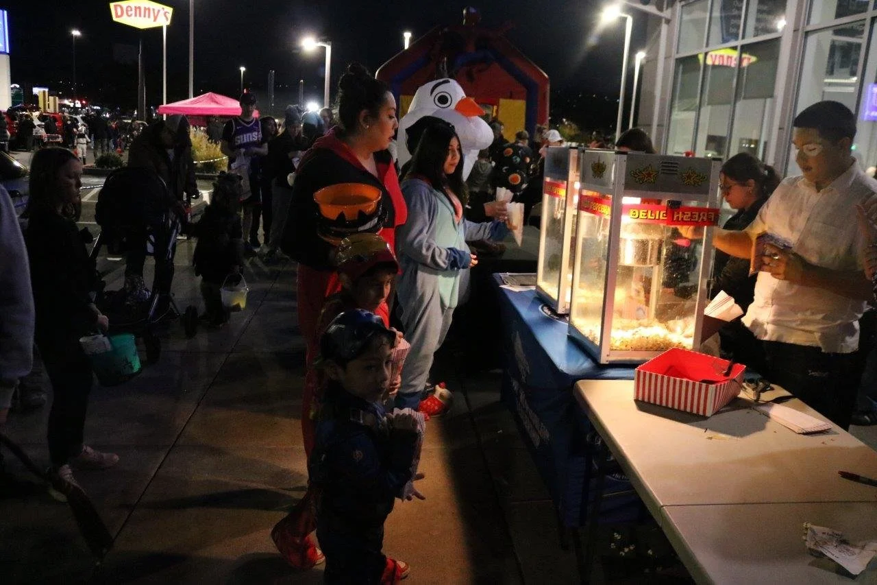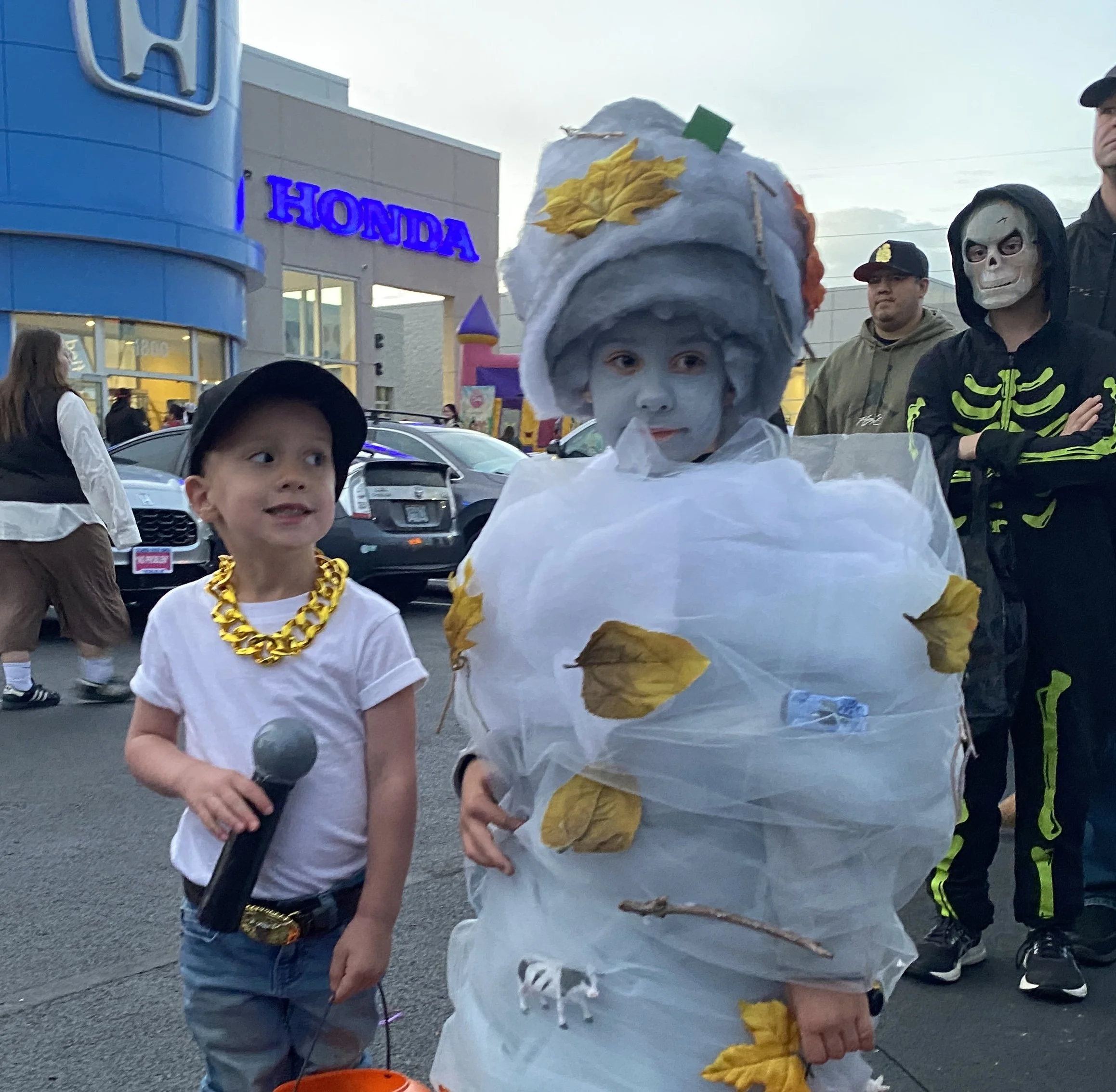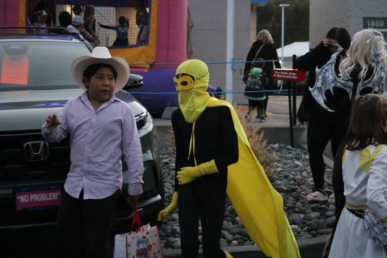 As the sun set over The Dalles, the dealership transformed into a lively Halloween carnival with witches, minions, anime heroes, Disney princesses and multiple Spider-Men moving between decorated trunks. The Dutch Bros. team hosted a “pumpkin bowling” game, while the dealership offered free popcorn — manned by high school volunteers dressed as David Bowie and Homer Simpson — and cotton candy bubbling from a cauldron inside the showroom.