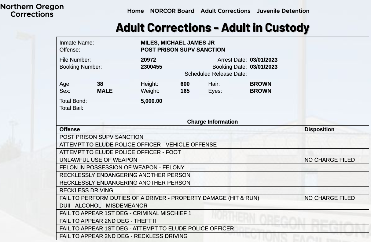 After being tased, Michael James Jr. Miles, 38, was taken to Mid-Columbia Medical Center before being transported to jail.