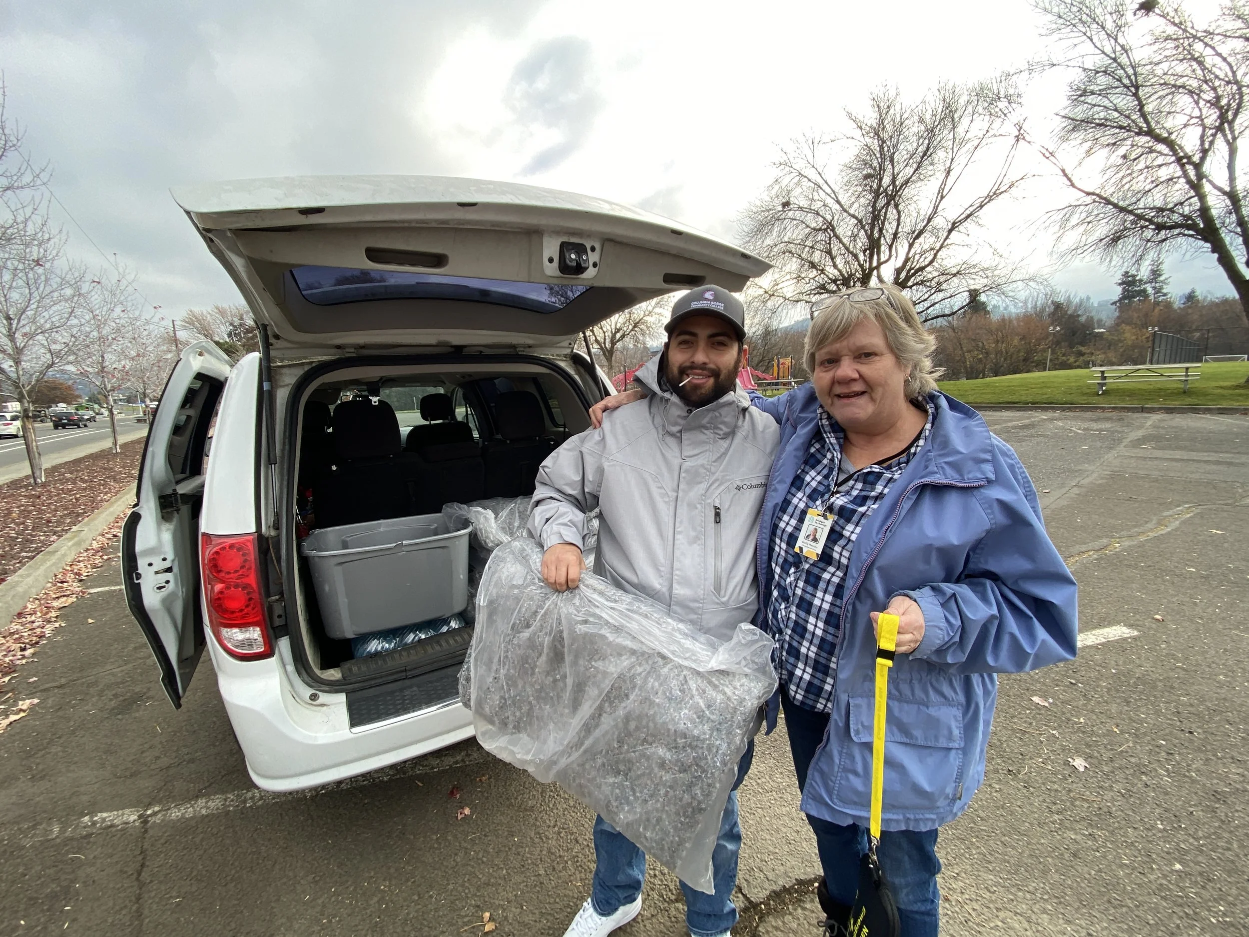 Martin Rivas and Shelley Hansen with Bridges to Change were on hand this afternoon, handing out blankets from the Thompson Park parking lot.