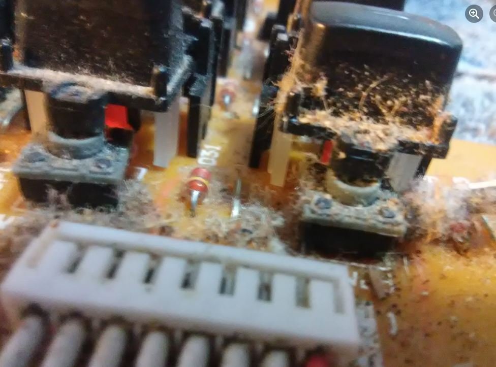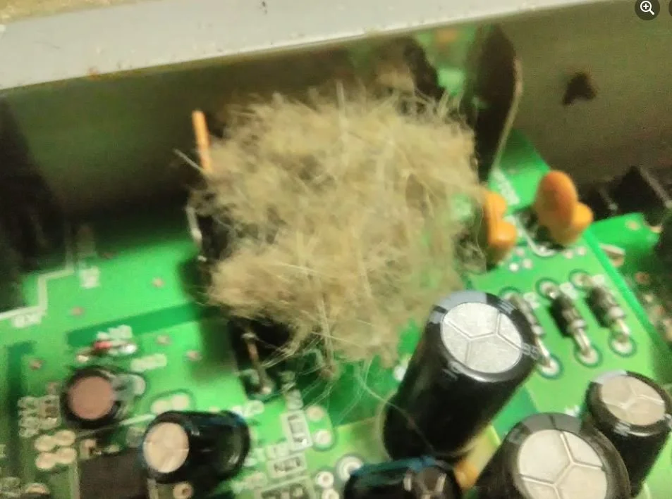 Similar to opening up King Tut’s Tomb, removing all of the slightly rusted screws from the back panel reveals an unexpected sight that no one could have predicted - a proliferation of Hair - not only mixed with Dust and Debris and clinging to potentiometers and resistors, but clear evidence of Hair that has been gathered as a Nesting Material.
