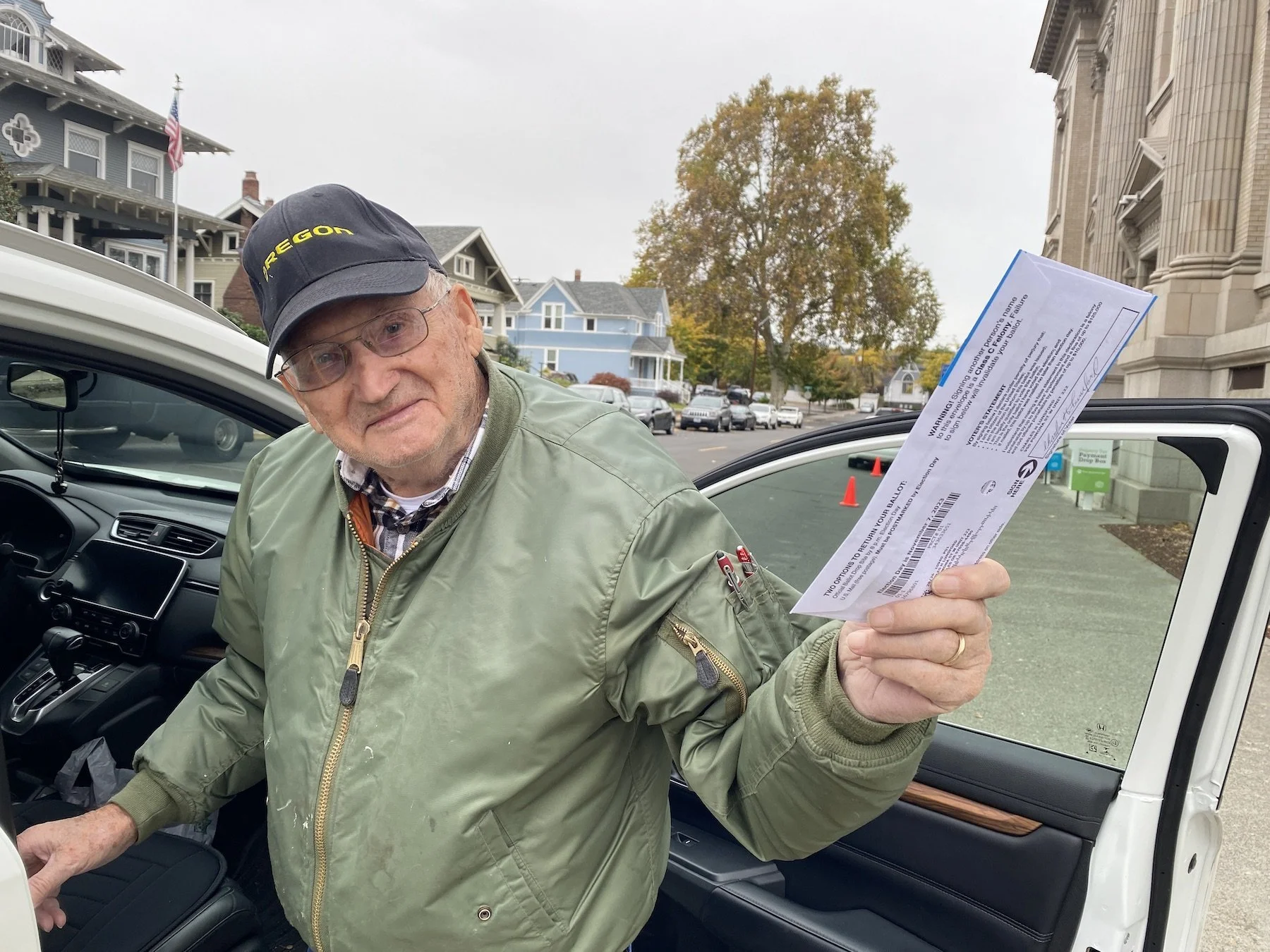 Charles Lunsford shows off his ballot this morning, Oct. 24, at the Wasco County Courthouse. There is only one decision to make on this ballot for people living in the North Wasco County School District. To build a new high school or not.