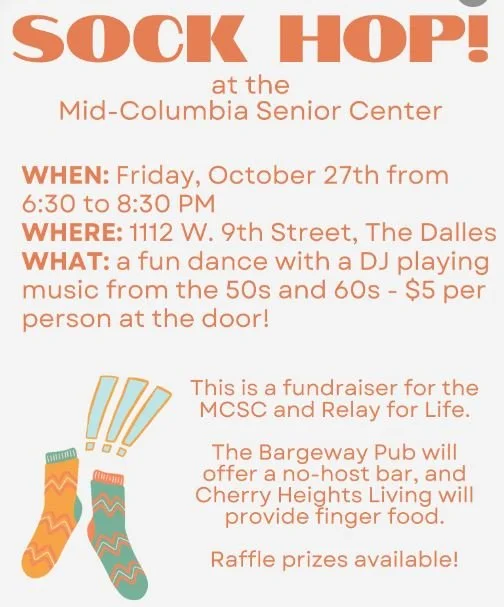 The Mid-Columbia Senior Center in The Dalles presents a Sock Hop on Friday, Oct. 27, from 6:30-8:30 p.m. Expect a fun dance with a DJ playing music from the 50s and 60s. This is a fundraiser for the MCSC and Relay for Life. The Bargeway Pub will offer a no-host bar, and Cherry Heights Living will provide finger food. Raffle prizes available. $5 admission.