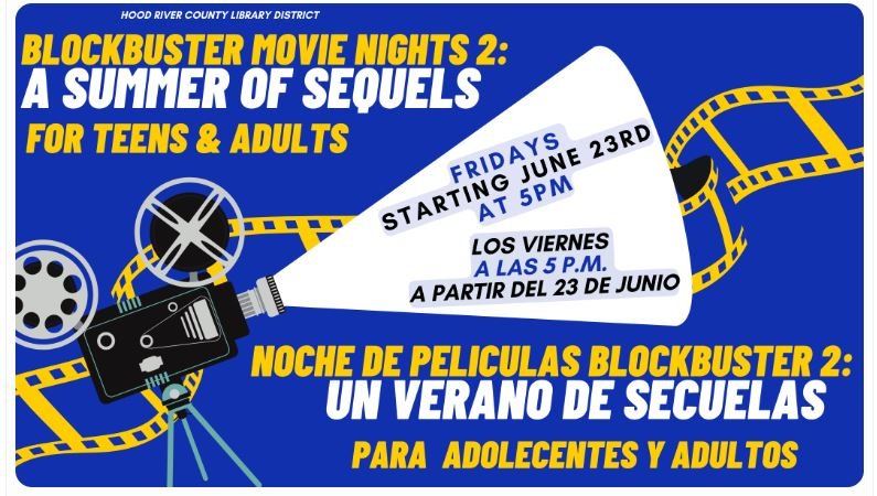 Join the Hood River County Library for a showing of favorite Blockbuster movie sequels Fridays in July and August, at 5 p.m. Most movies are best for Teens and Adults, snacks provided.