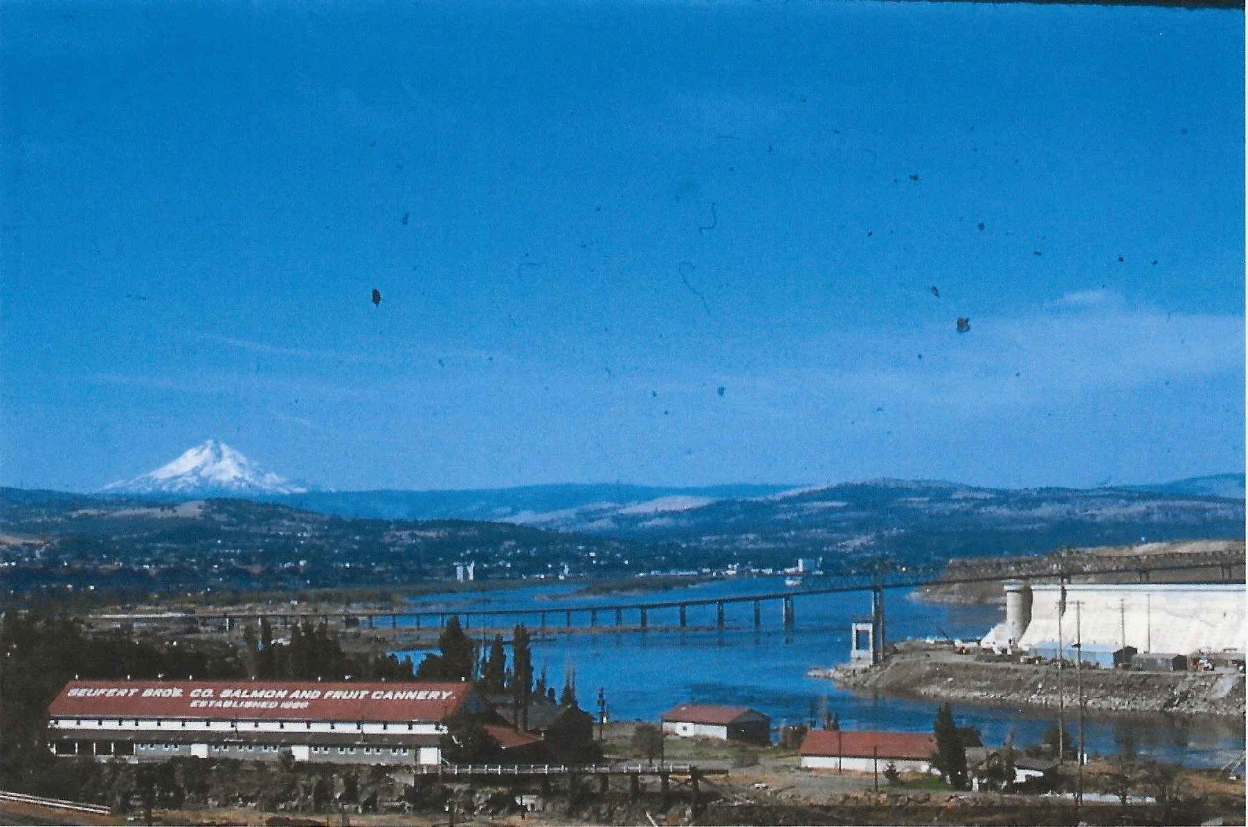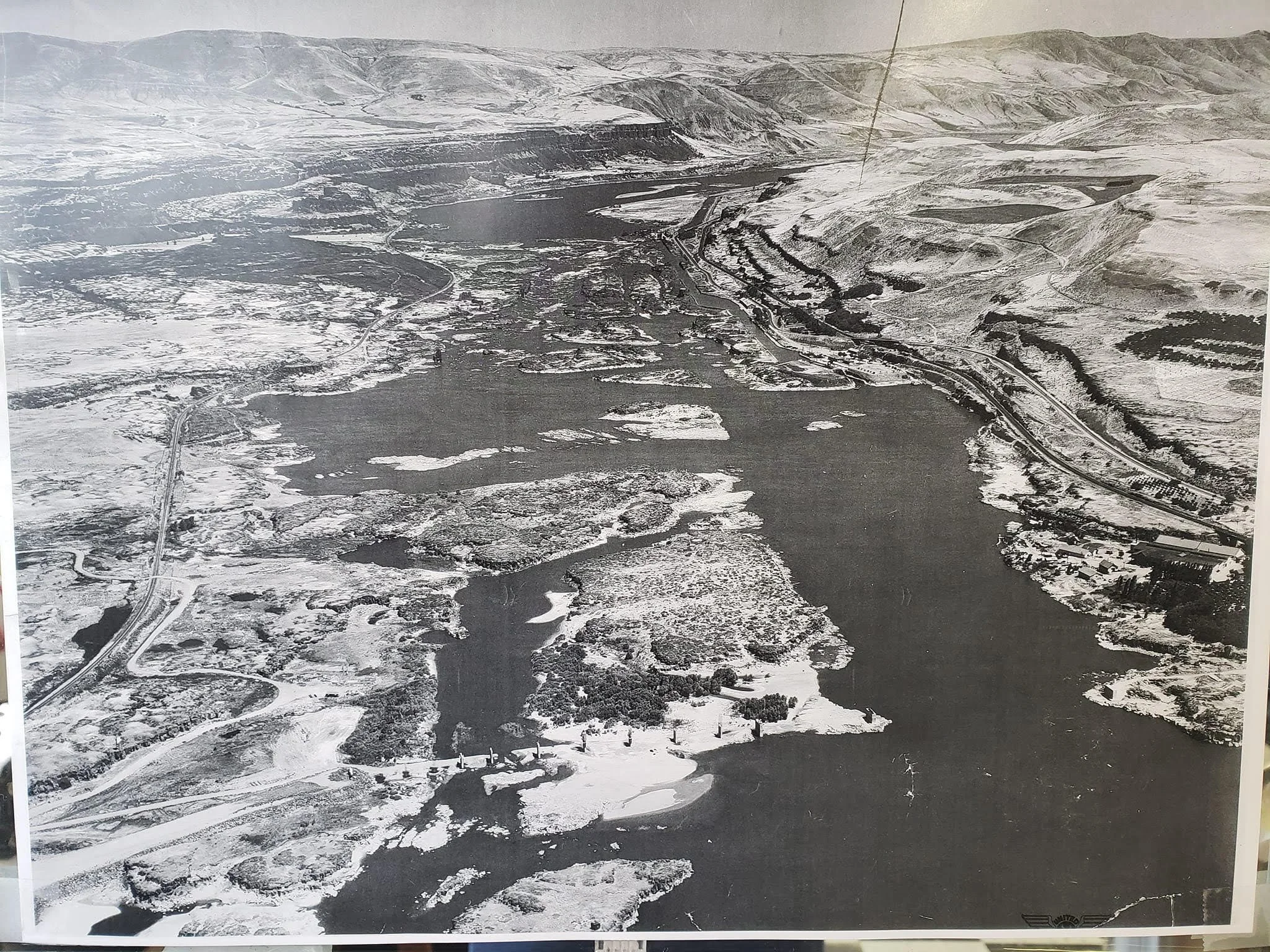 John Foley also supplied this photo which shows the concrete supports toward the bottom of the photo for the bridge that was never built. The original location was moved as the siting of The Dalles Dam took precedent over the highway bridge.