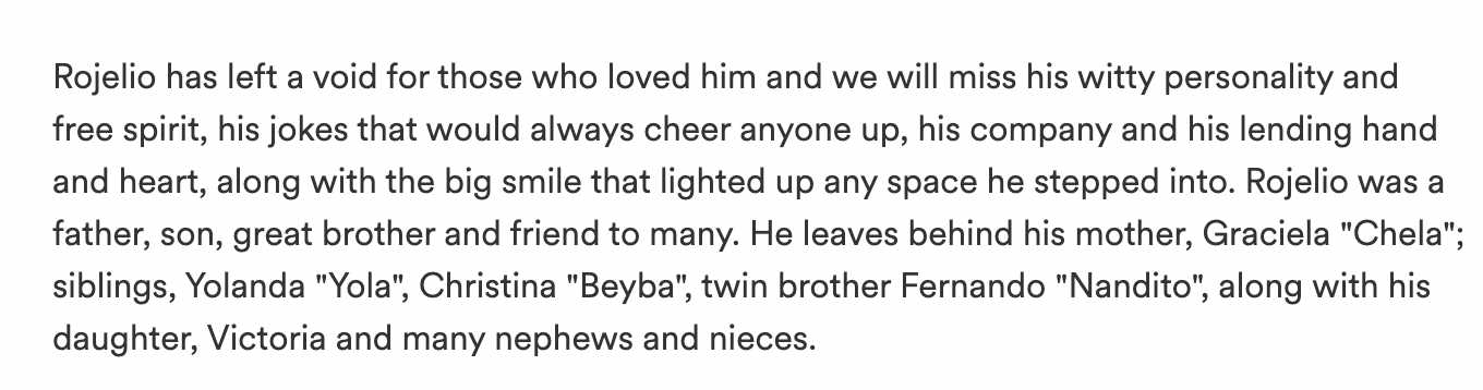 In addition to his daughter, Rojelio also had a twin brother and his mother who have been devastated by his early death.