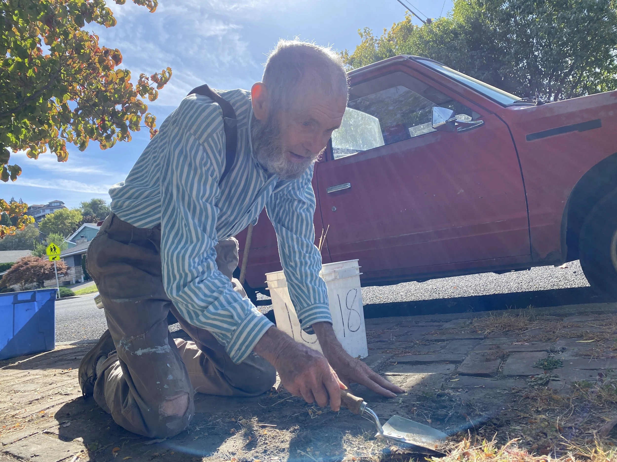 Tom Somerville was hard at this morning using his trowel to remove knotweed, dandelion and cat’s ear from the bricks outside a home on east 19th Street in The Dalles. “I started here in the sun,” he said, noting the morning chill sent him on a hunt for warmer climates within the yard.