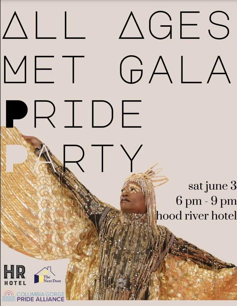 A free all ages Drag Queen Story Time and followed by a Queer Met Gala Pride Party at the Hood River Hotel on June 3rd. (Click here to sign up to volunteer at the Hood River Hotel Pride Party.)