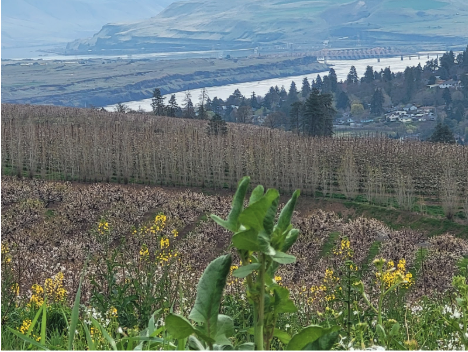 Stand halfway up a twelve-foot aluminum orchard ladder on a hillside above the Columbia River. Feel the slope beneath your boots. Look out over the water. Watch the wind move through the rows.