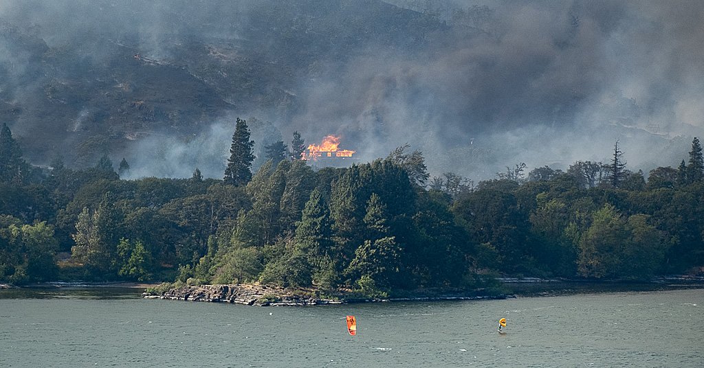 Hilltop house burns above Columbia River during the Tunnel 5 Fire in July 2023. Photo: Jurgenhessphotography