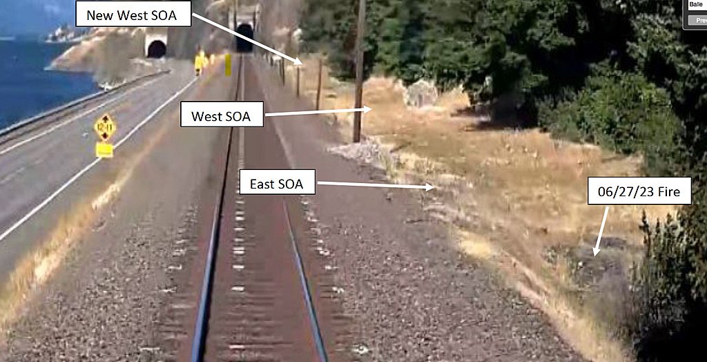 This image was captured by an Amtrak train’s forward-facing camera about two and a half hours before the start of the Tunnel 5 Fire. SOA indicates “Specific Origin Area” of the fire. A note in the bottom right corner indicates the area where a small fire burned just days before the Tunnel 5 Fire. Photo: Wash. DNR