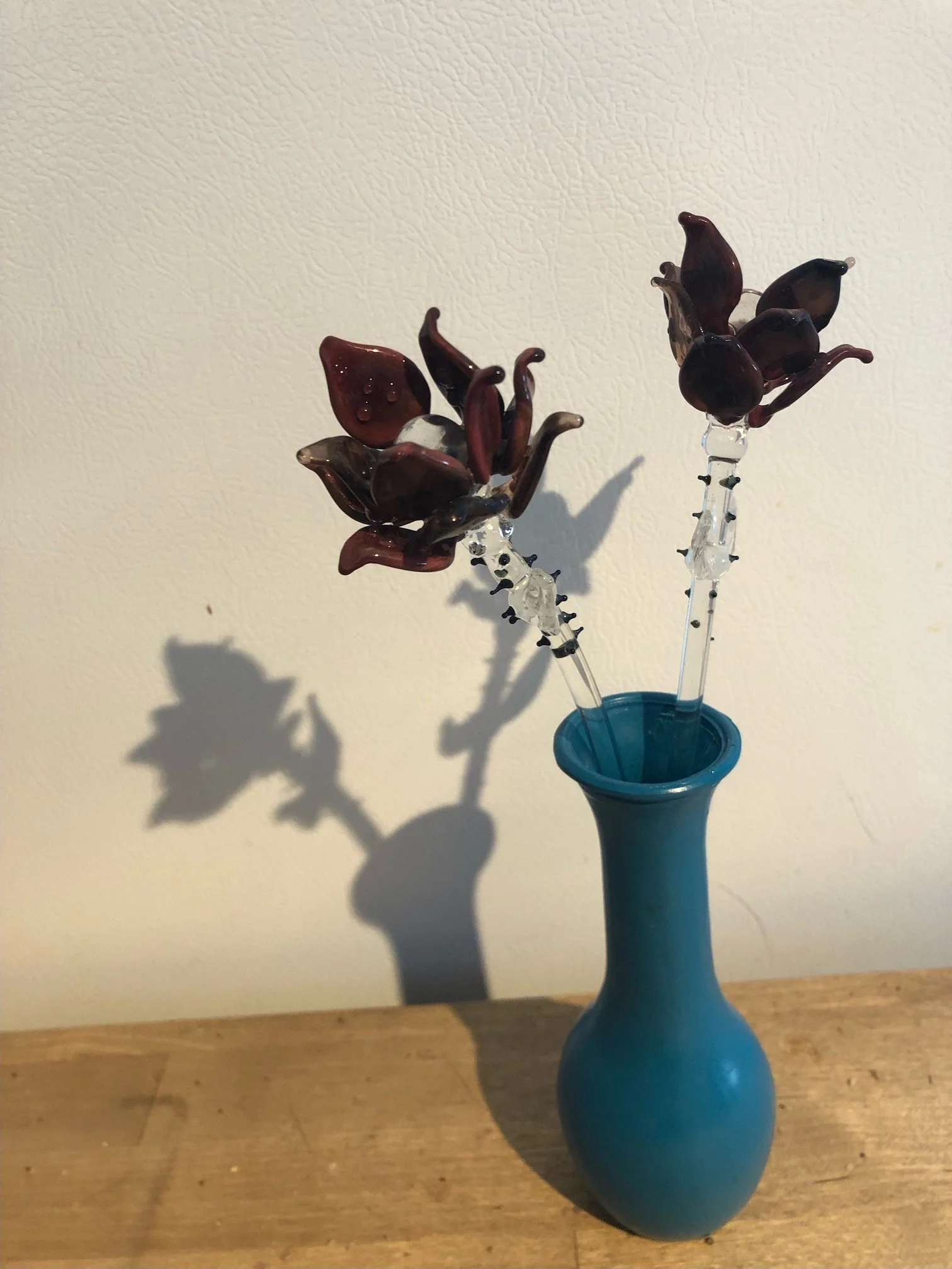 By melting the glass, he changed it’s rigid shape to a soft liquid, then into fragile curved petals. Green rods of glass became ruffled leaves. He clustered several petals together, attached leaves, creating long-stemmed roses. With a single drop of glass, he kissed each rose with a shimmering dewdrop. He fashioned full bouquets of stunningly delicate blooms. In so doing, he was able to lift his spirits beyond the dismal confines of his condition.