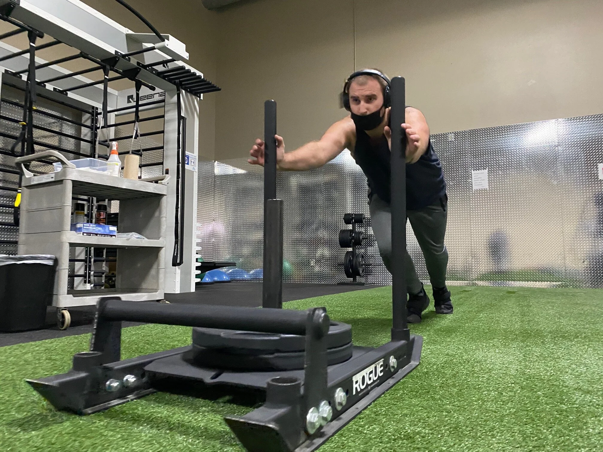 Kenny Haener of The Dalles gives the power sled a concerted push at The Dalles Athletic Club.