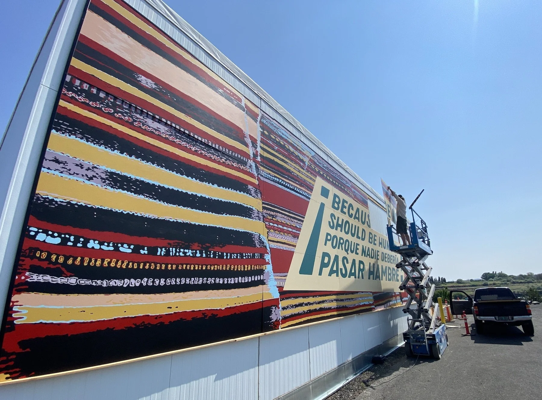 May 2024 - Artist Chris Pothier of The Dalles was braving the heat this morning while installing 18 art panels at the new Columbia Gorge Food Bank building in the Port of The Dalles.