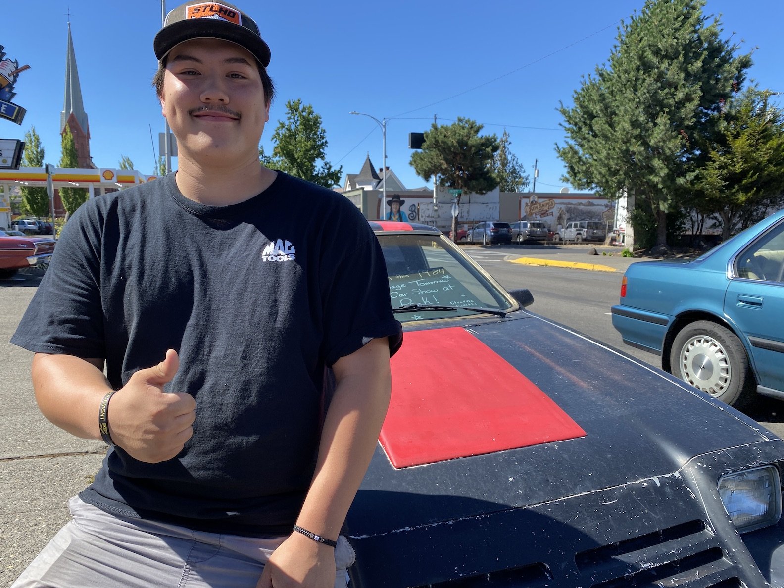 Anson Jones, 17, of The Dalles was all thumbs up this afternoon out front of Burgerville in downtown The Dalles. He and his dad Dennis are raffling this 84 Dodge Rampage for $5 a ticket. Anson said the proceeds will go to The Dalles Lions, who work to assist children with vision problems.