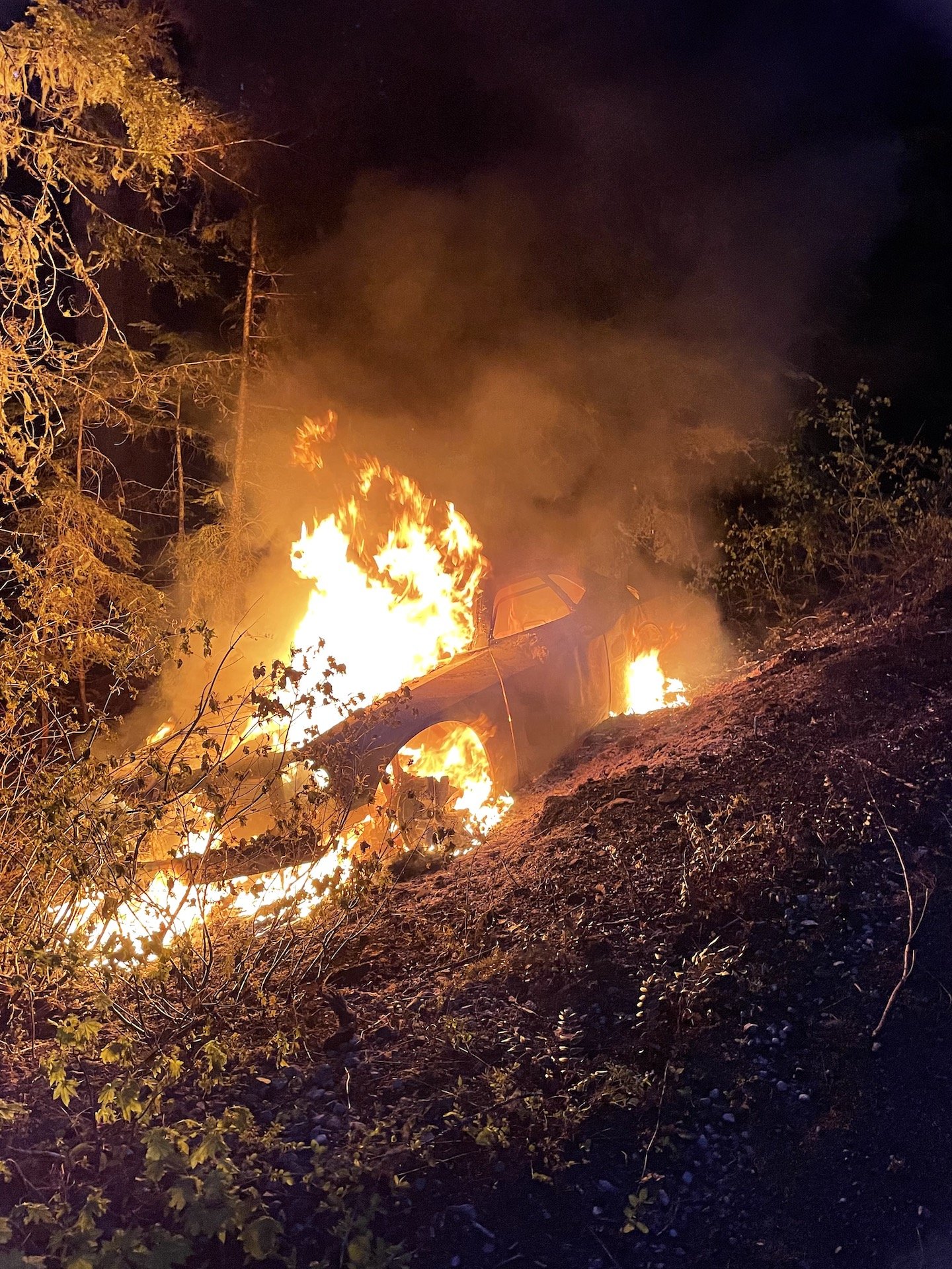 This Dodge Challenger ended up off the side of the road and on fire in Southwest Wasco County on Friday, June 24 at around 8:45 p.m. Campers reported seeing a male walking away from the vehicle after it caught fire and fireworks inside it were going off.