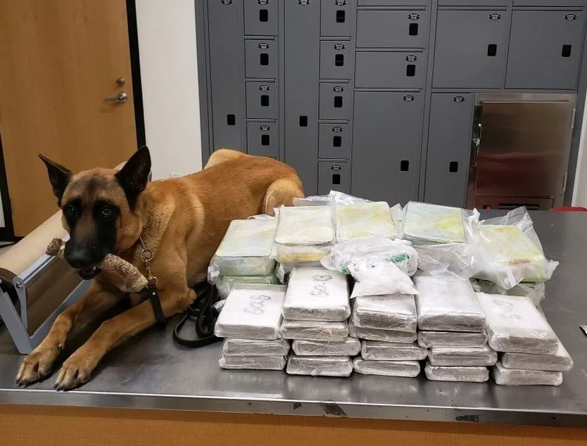 On April 23, 2023, an OSP Trooper out of the Salem Area Command stopped a vehicle and his K-9 Titan located 51 lbs. of suspected Methamphetamine, 31 lbs. of suspected powder fentanyl ,9 lbs. of suspected cocaine, 2 lbs. of suspected heroin during a traffic stop.