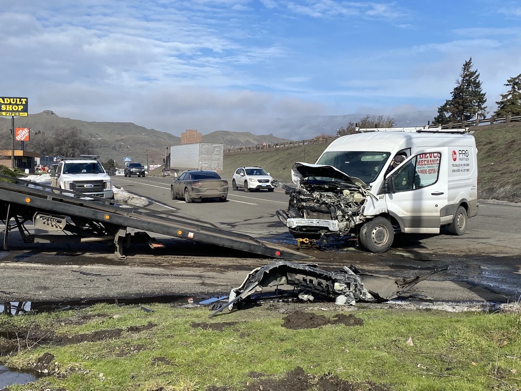 The Dalles police said a vehicle pulling a trailer was at fault when it drove south across the intersection and the van collided with it.