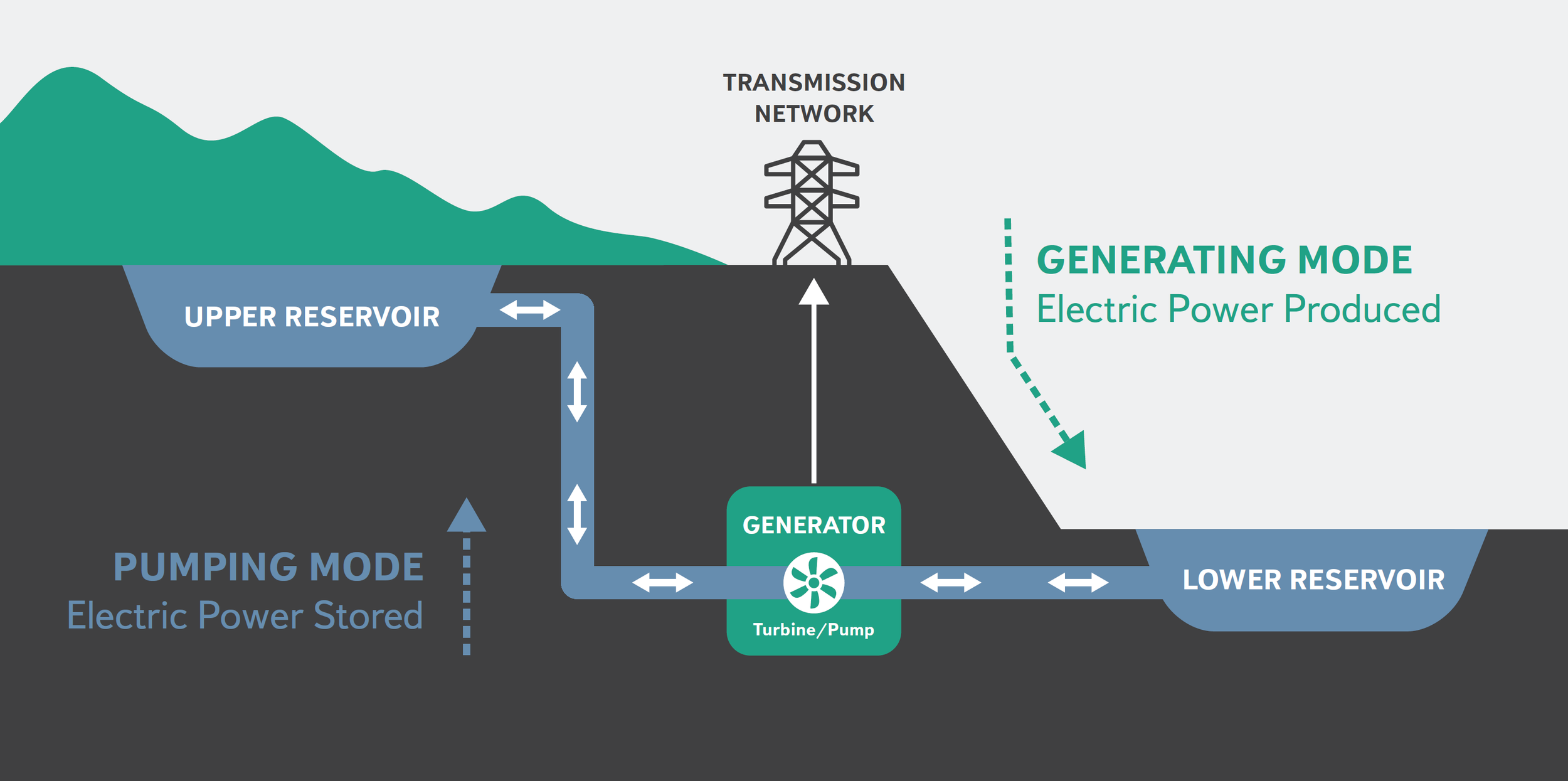 Pumped storage acts as a giant water battery, moving water between a lower reservoir and an upper reservoir. When renewable energy from wind and solar is plentiful, the system uses it to pump water uphill. When power demand is high, water is released through hydroelectric turbines to generate on-demand renewable energy. In a closed-loop facility like the Goldendale Energy Storage Project, the system is filled with water once. The same water is reused, continually storing and dispatching renewable energy