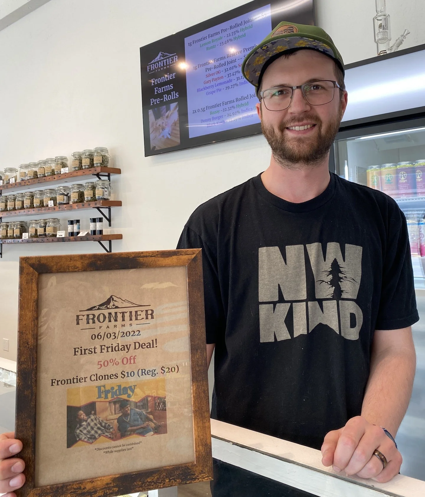 Robert Koval shows off the discounts at Frontier Farms, 609 E. Second St., as the cannabis dispensery will also be participating on Friday night with 50% off Frontier Clones.