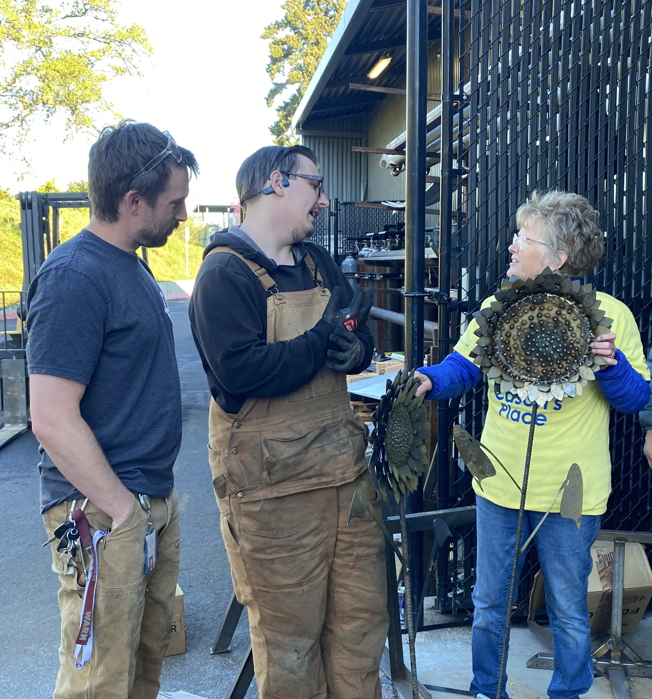 That mission brought them to the Columbia Gorge Community College Skills Center in The Dalles on April 16 — not just to pick up steel, but to pick up pieces of something larger: sunflower kits that would soon become symbols of healing.