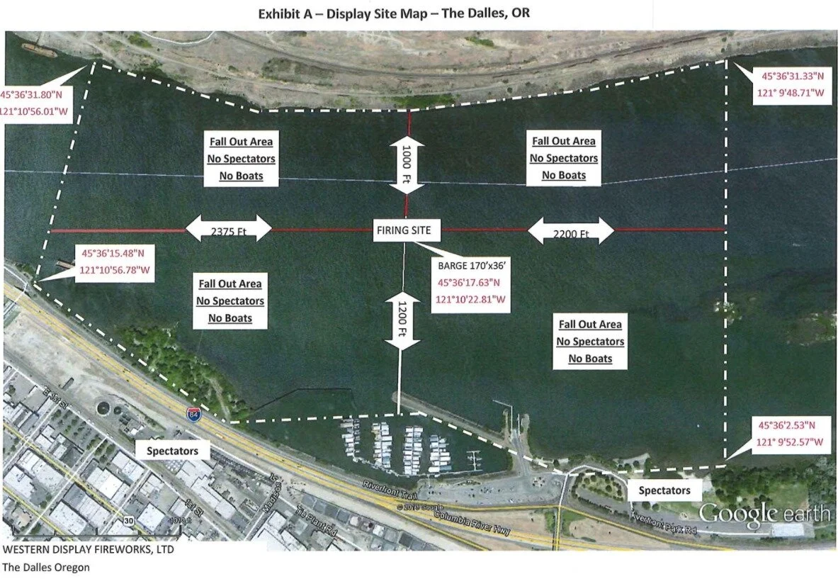 Bernert Barge Lines in The Port of The Dalles has donated use of their barge for launching the rockets for years as well. They typically anchor the boat in the river between the Union Street Dock and The Dalles Marina based on wind conditions. Their contributions easily cuts costs for the display by more than $10,000.