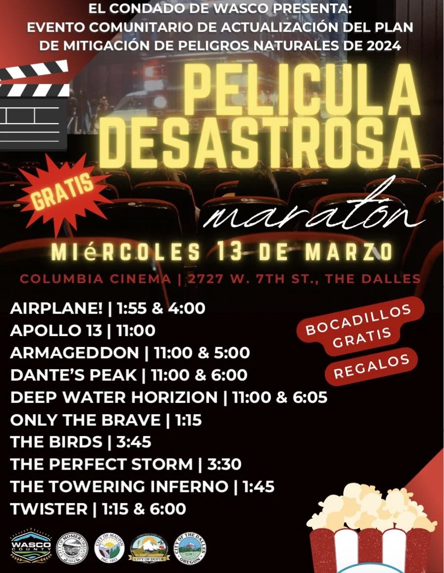 The Dalles, Ore., March 4, 2024 — On March 13, 2024, the City of The Dalles and Wasco County will host a free Disaster Movie Marathon at Columbia Cinema, located at 2727 W 7th St. in The Dalles. Members of the public are invited to watch a variety of disaster themed movies, enjoy free snacks, prizes and take part in a community survey on disaster prepardeness.