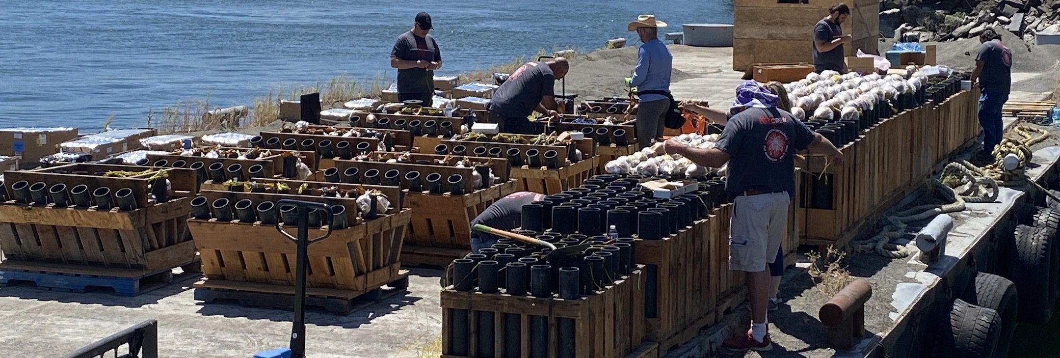 Blowing stuff up does not come easy. This crew worked for hours this morning preparing the barge with cannons and mortars for The Dalles Fourth of July fireworks show. Bernert Barge Lines lends use of a barge, crane, tug and staff to load the 10-inch cannons every year for the fireworks display. It cuts thousands of dollars off the cost of the show.