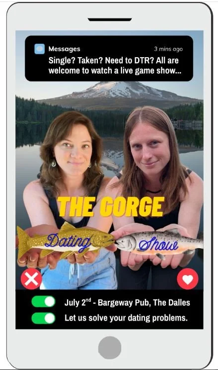 Come watch (or participate in!) a live game show about dating in the Gorge! The Gorge Dating Show is a weird-but-fun event series for romantics, realists, “I’m in love with my kayak” people and everyone in between. Whether you’re looking for sparks, sidekicks, or just a good story to tell, we’re here to make meeting people a little less awkward and a lot more fun for everyone involved.