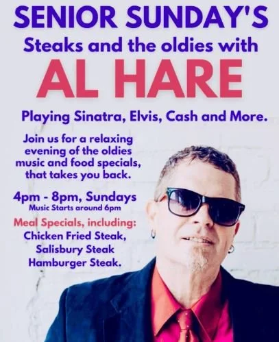 Indulge in some of the classics like Hamburger Steak, Chicken Fried Steak, or Salisbury Steak. Musician Al Hare will serenade you by performing some of the iconic hits from musicians such as Elvis & Johnny Cash.