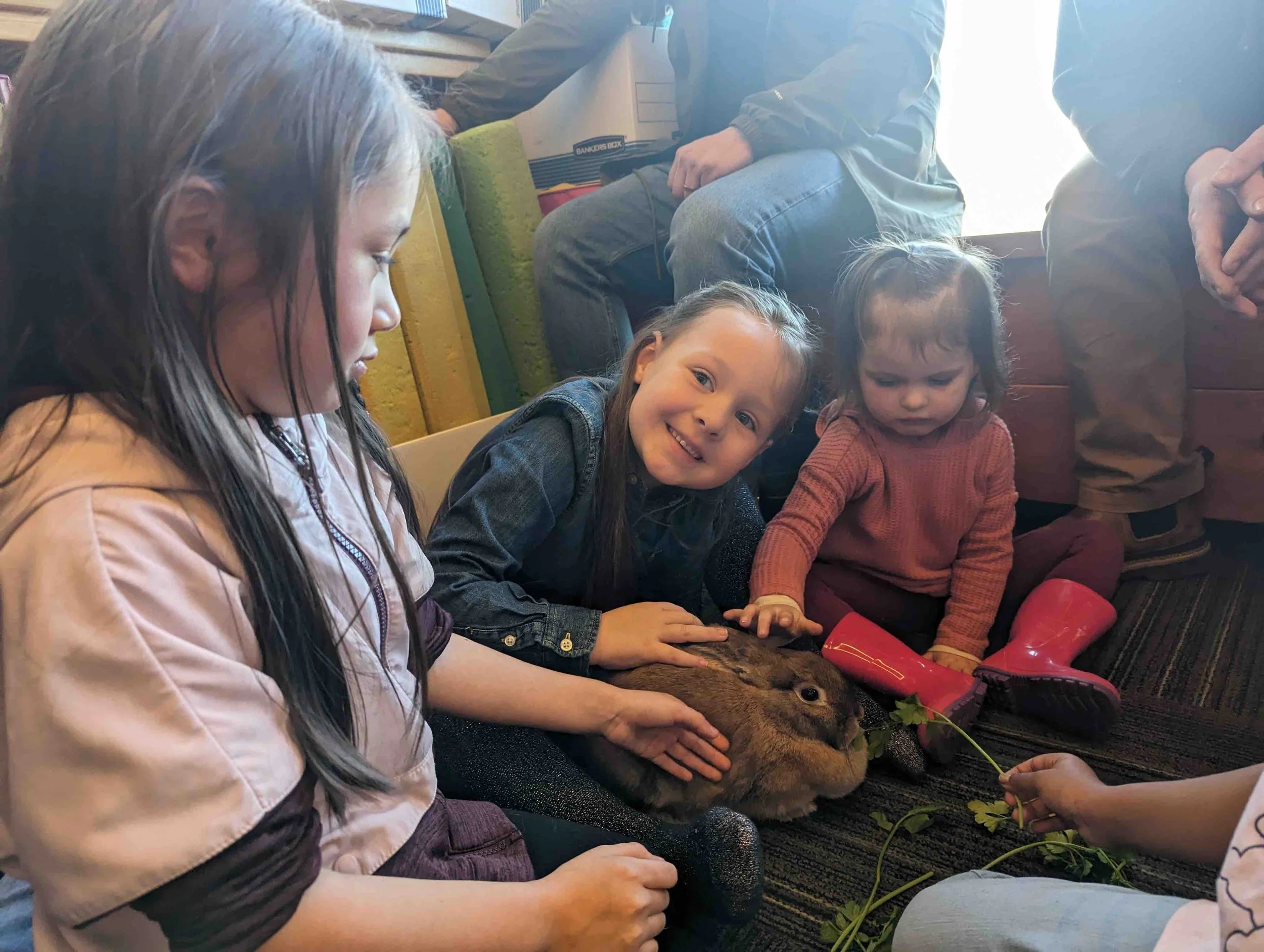 A bunny munches on some parsley while kids enjoy getting to pet the bunnies soft fur.