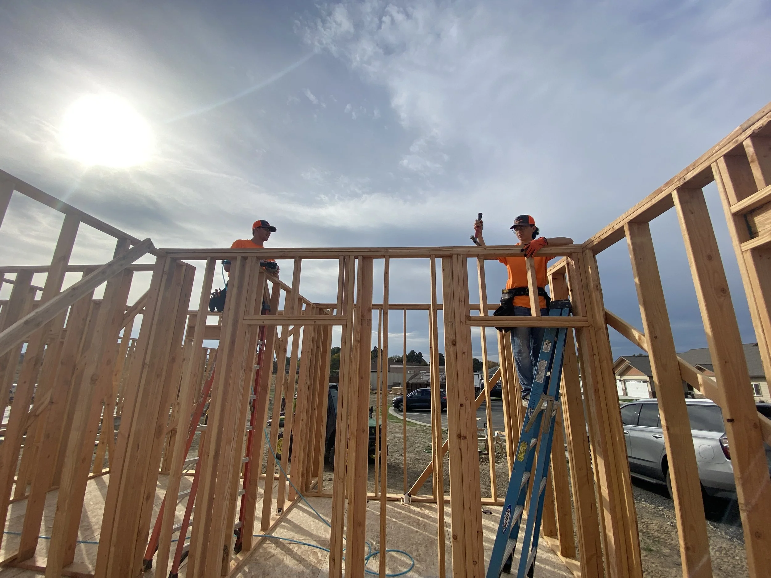 Students use nail guns to cap a wall at the newest home site in Hermiston.