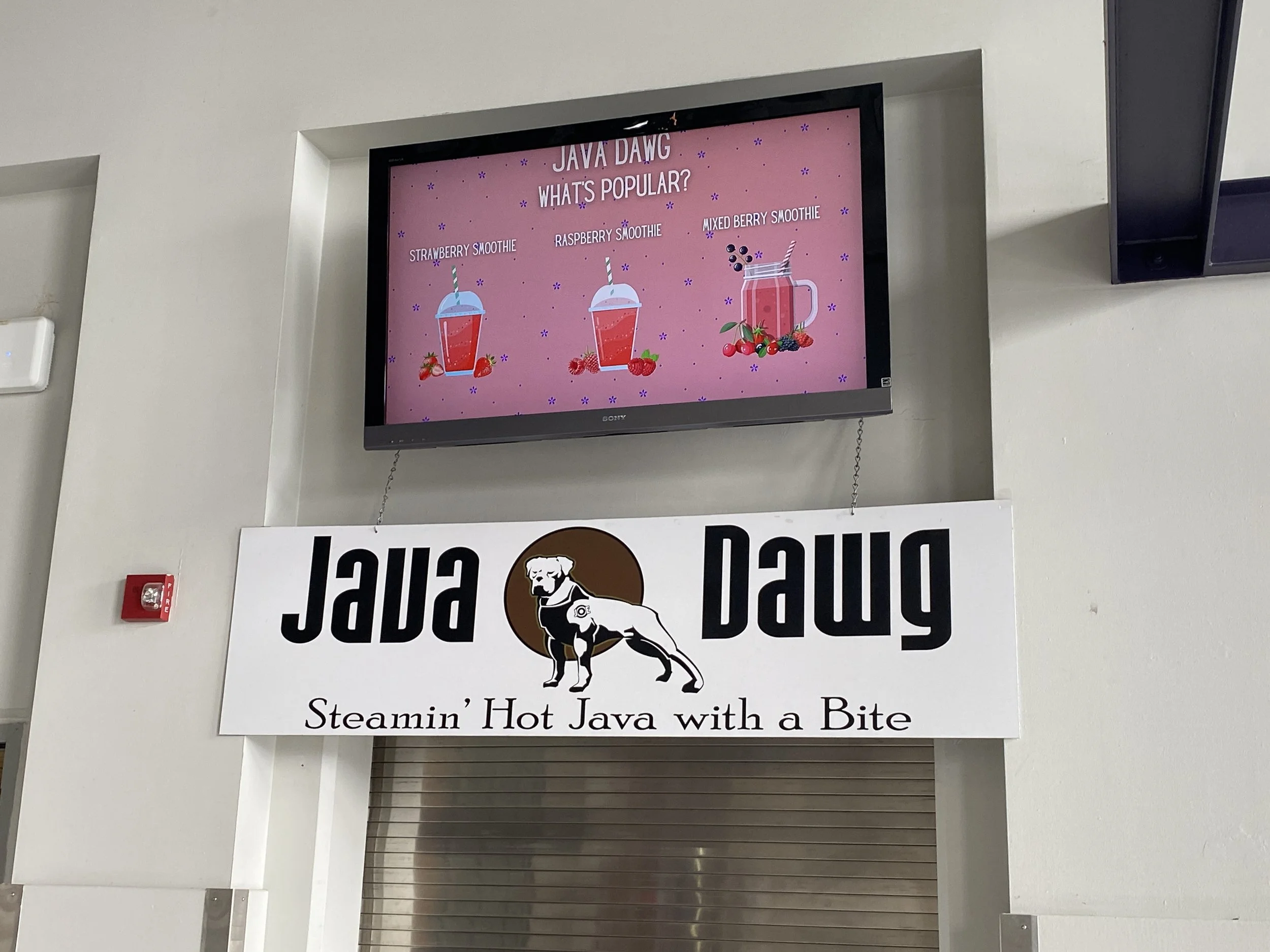 A student wrote the code for this Java Dawg coffee shop display. The banner was designed and created by students in the Arts, Information, and Communications program.