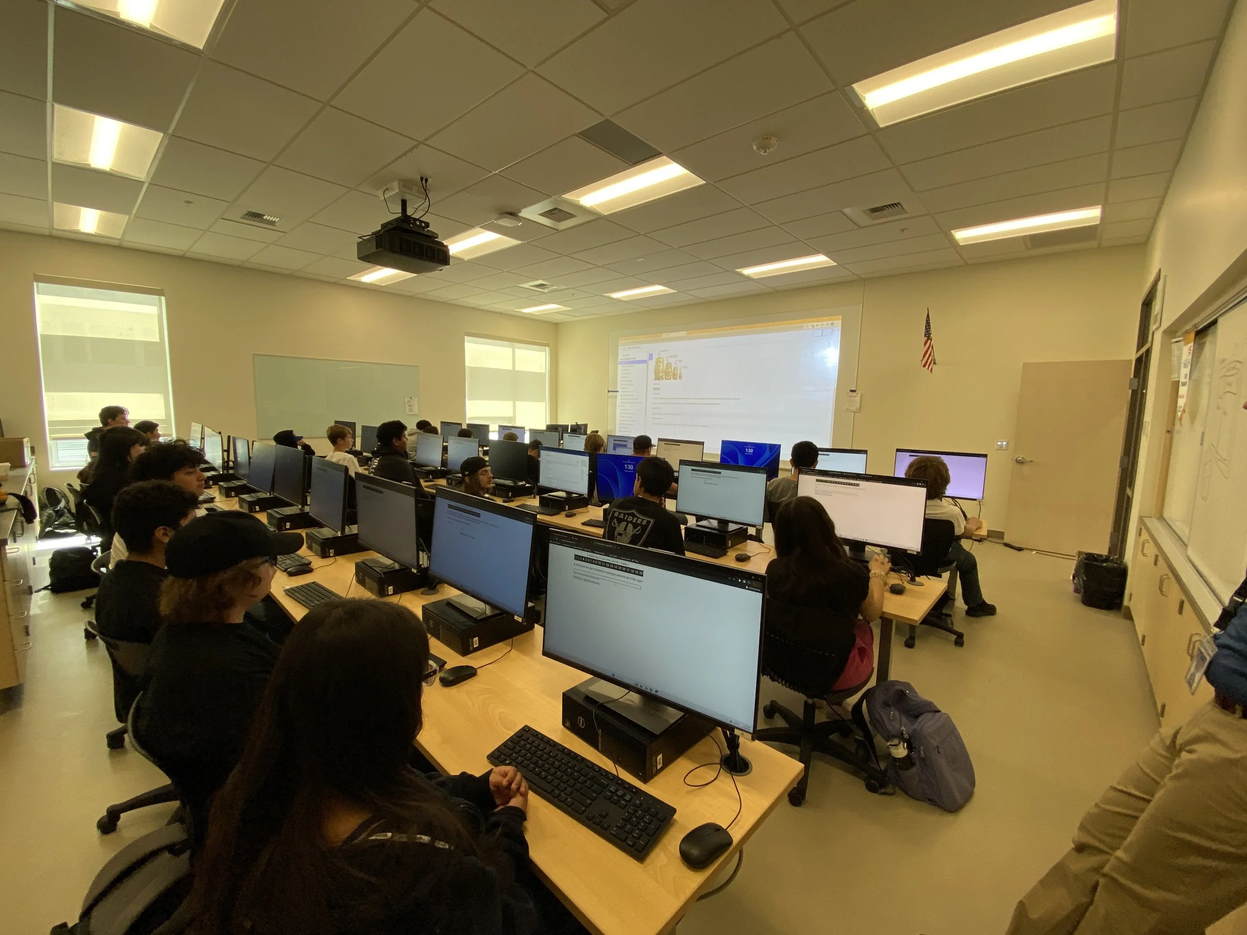 Students work on code during a computer science class at Hermiston High School. Again, students have modern computers. A large visual display at the front of the room makes it easier for teachers to demonstrate and teach.