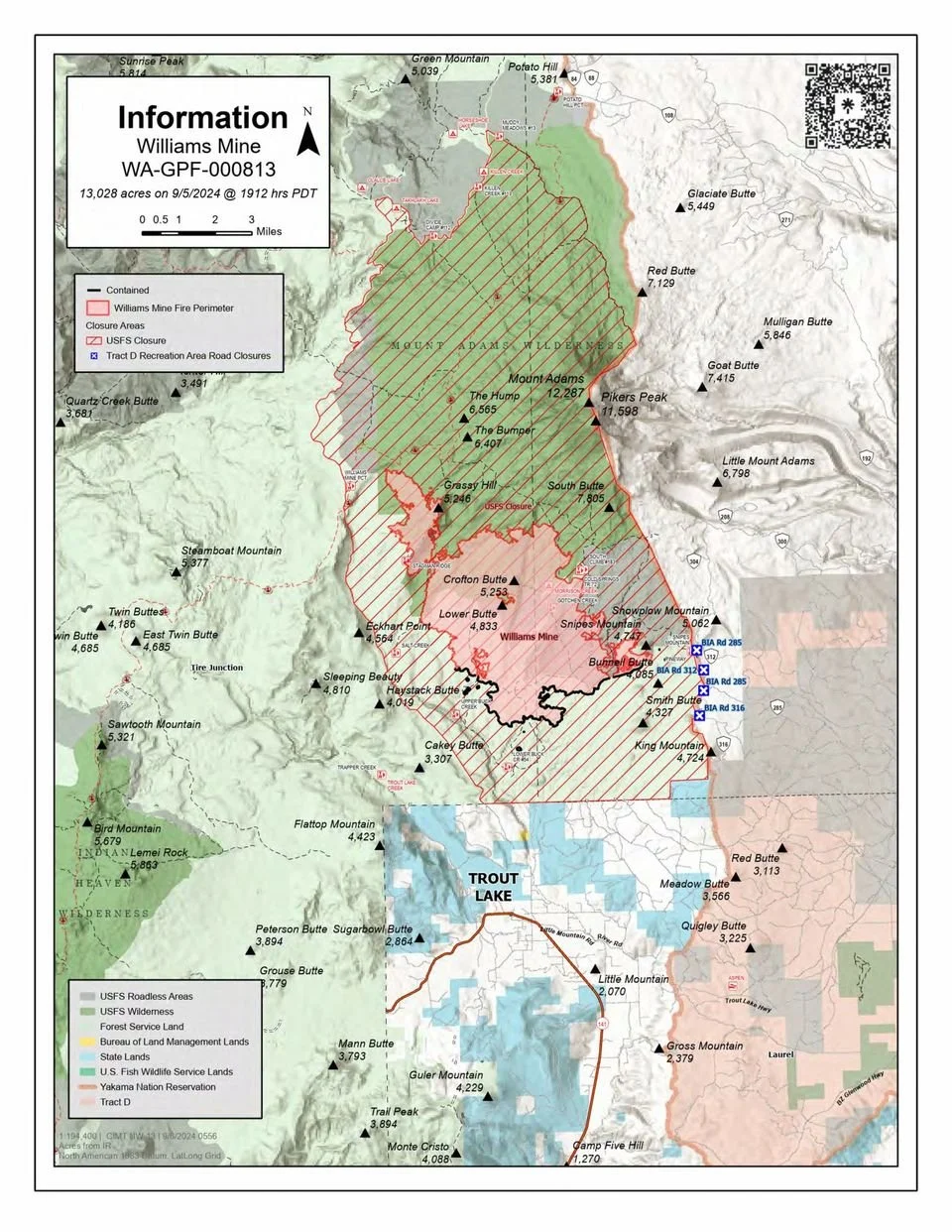 The Confederated Tribes and Bands of the Yakama Nation, Tract D Recreation Area is currently closed. FS Rd 23 south of FS Rd 90 is still CLOSED to the public due to fire suppression activity. Takhlakh Lake is still closed. The revised closure for the Mt. Adams Wilderness and FS Rd 23 closure can be found at Williams Mine Fire: Area and Road Closure. The Pacific Crest Trail (PCT) is closed from the PCT's intersection with FS Rd 23 to Potato Hill. The current area closure spans the entire Mt. Adams Wilderness. Public information: https://linktr.ee/williamsminefire Facebook: Williams Mine Fire Inciweb: http://inciweb.wildfire.gov/incident- Information/wagpf-williams-mine-firegonf E-mail: 2024 williamsmine@firenet.gov