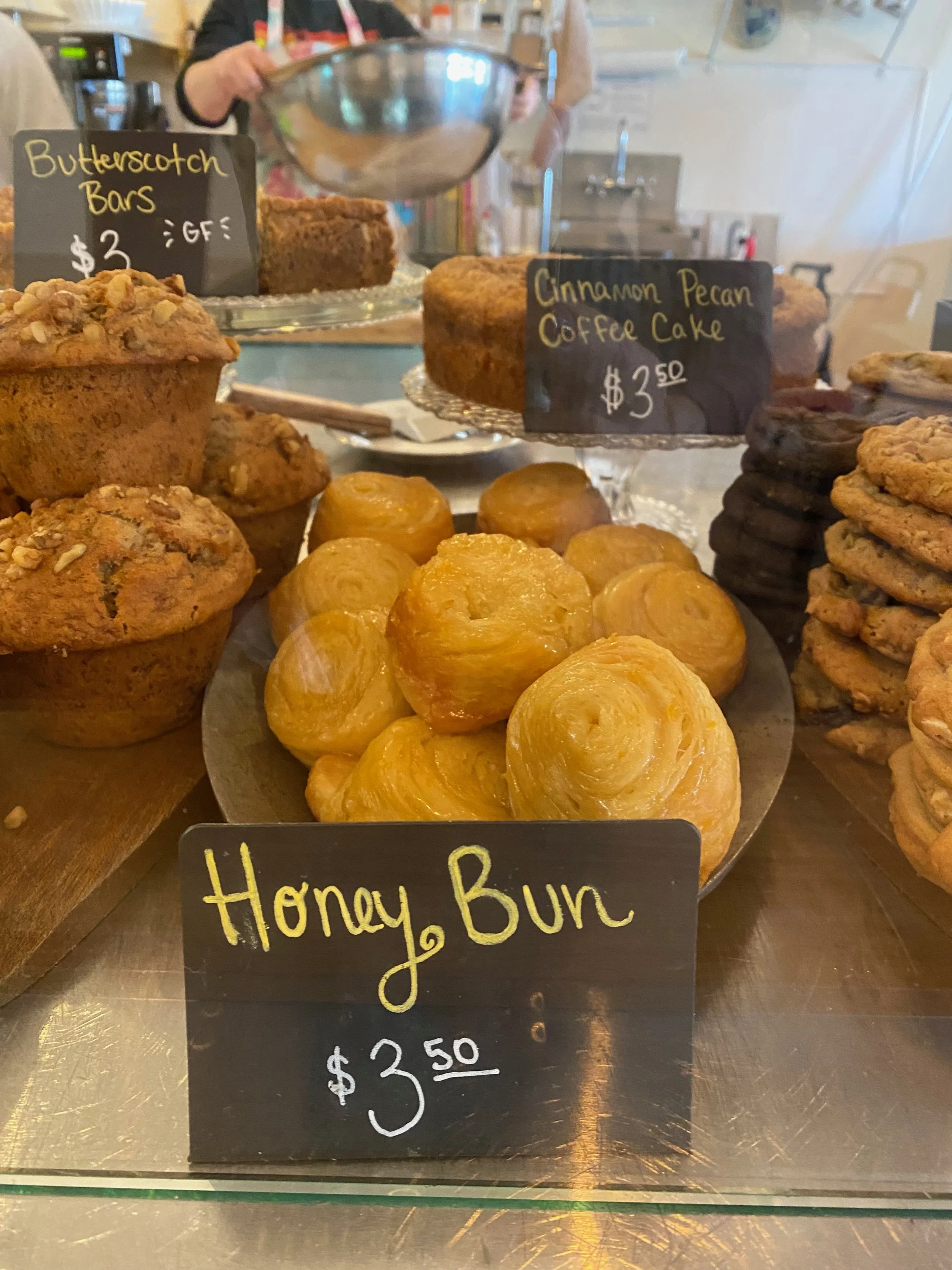 In June of 2023, after five months of intensive renovation, Madeline and her partner, Mike Johnston opened Honey Buns Café and Bakery on Maupin’s Main Street, in the location previously occupied by Xena Graphics. Local and visitor trade has been steadily brisk in the ten months since, patrons attracted as much by the owners’ warm welcome and the homey feel of the space as by the delicious house-made pastries and an array of coffee and other drinks.