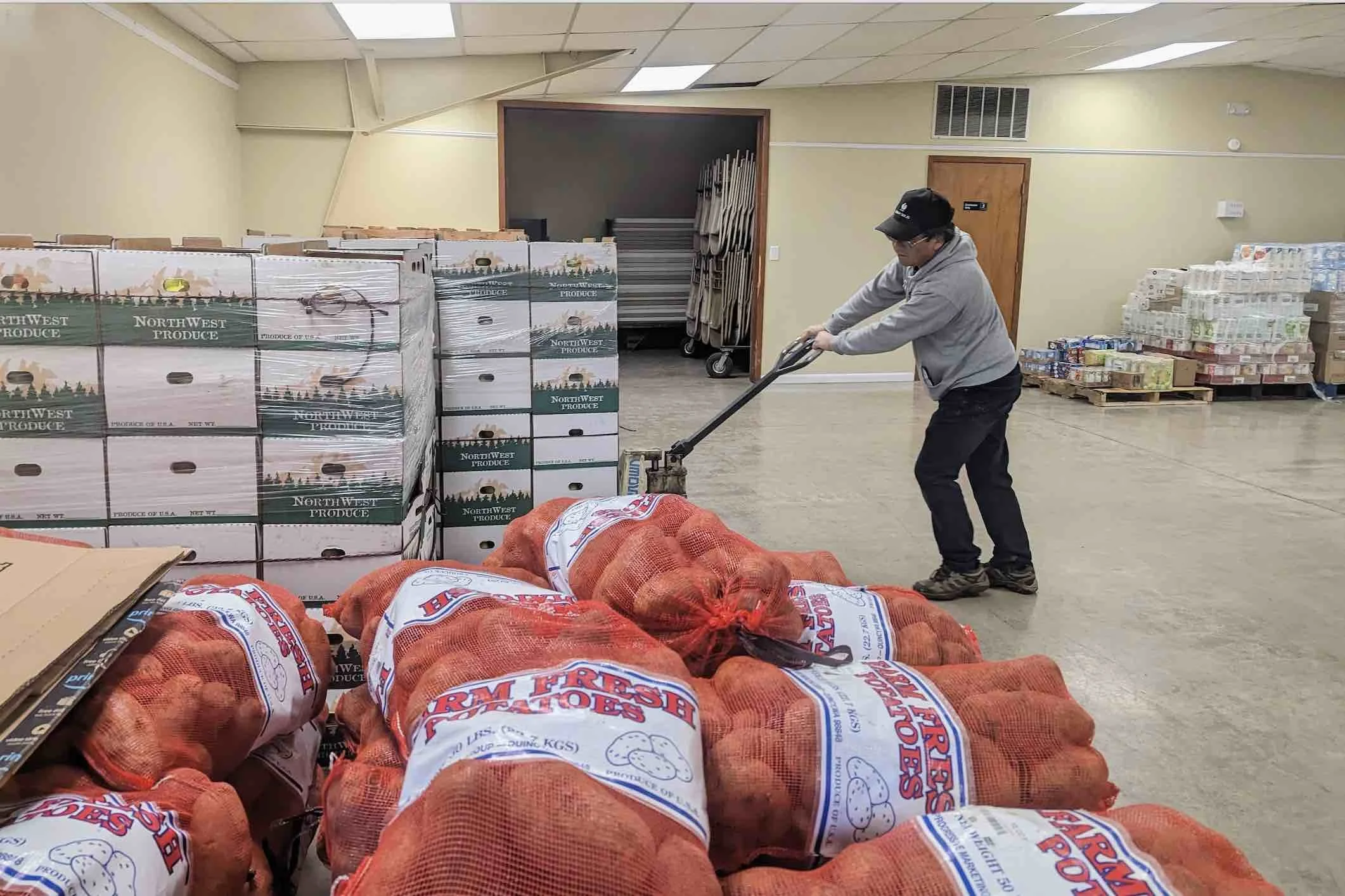 A volunteer wheels in a pallet of apples which will be sorted into food boxes for families in need. Photo Credit: Cole Goodwin