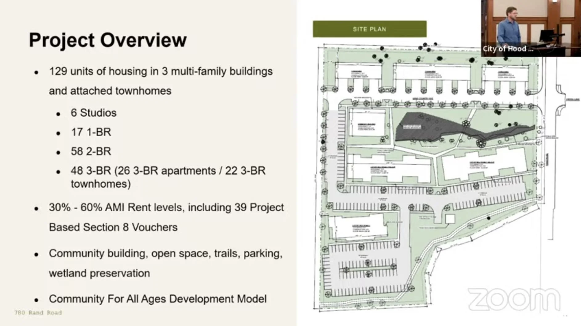 Developers gave an update on the 780 Rand Road Affordable Housing project to the City Council. The project world build 129 units in three mutli-family building and attached townhouses, community multi purpose building. The facilities would include six studio, seventeen one bedroom, fifty-eight two-bedroom, forty-eight three-bedroom apartments, and twenty-two three-bedroom townhomes.