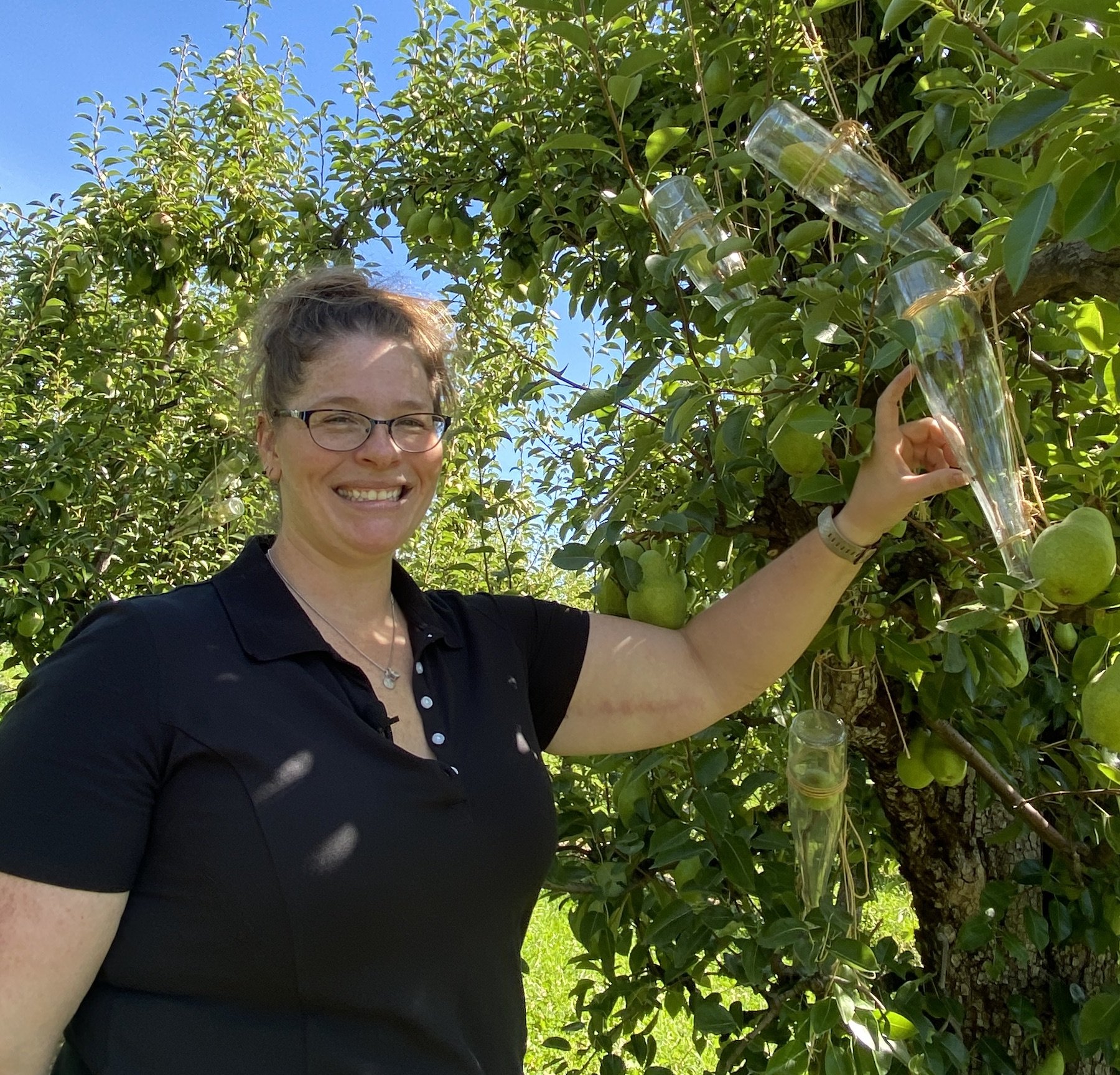 Head Distiller Caitlin Bartlemay shows off pears in a bottle at an orchard near Hood River.