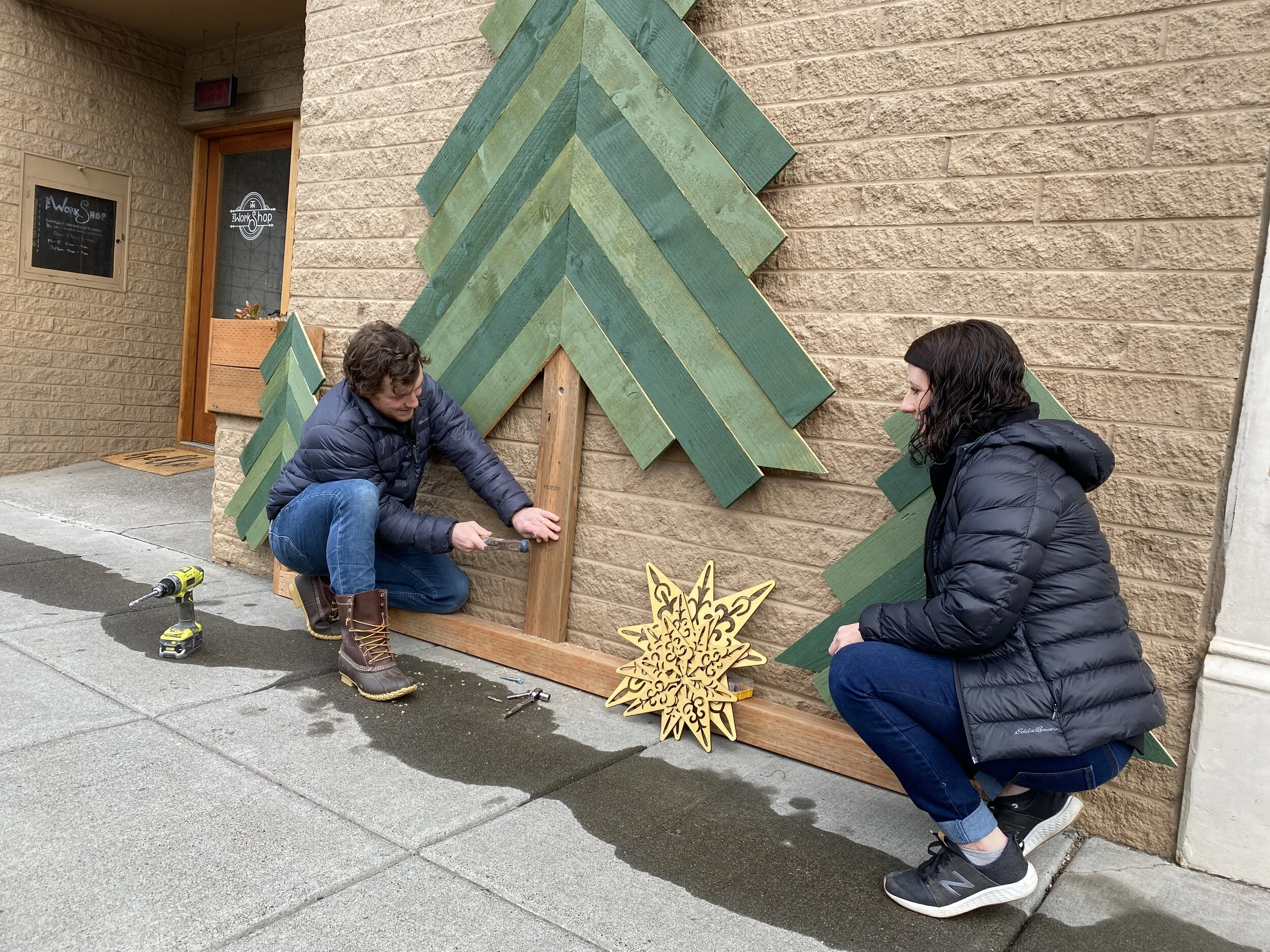 A little Christmas spirit had Tom and Lindsey Giamei putting up this DIY tree on the side of their business, The Workshop at 201 E. 2nd St., this morning, Black Friday, Nov. 27. The workshop offers a whole line of DIY projects as well as some pretty cool TD garb. Check them out here. The couple is also supporting the Festival of Trees program, inviting community members to decorate an ornament for a donation that will help support the Celilo Cancer Center at Mid-Columbia Medical Center in The Dalles. That’s a lot of good stuff by 9:30 a.m. - Santa might want to count the elves. A couple may have escaped :)