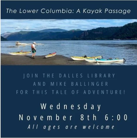 The Dalles Library presents a tale of a Columbia River Adventure with “The Lower Columbia: A Kayak Passage,” with Mike Ballinger on Wednesday, Nov. 8, at 6 p.m.