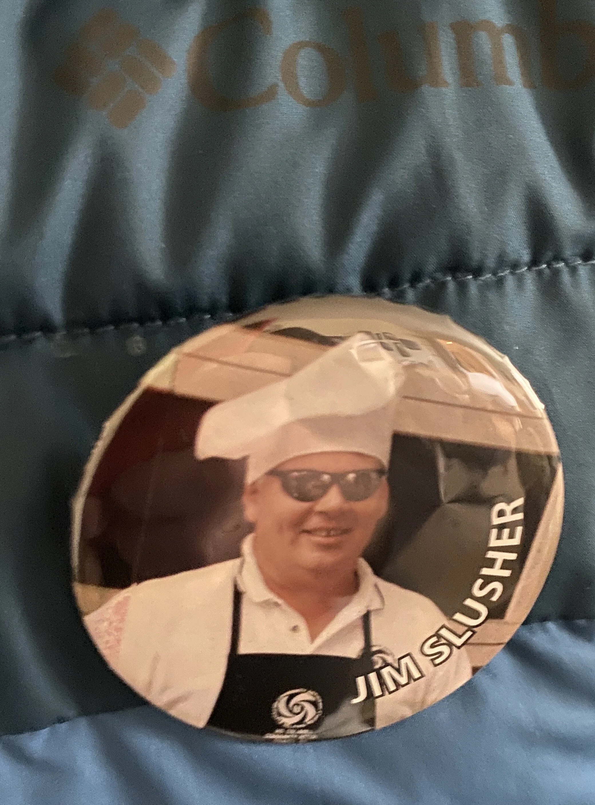 Buttons of Jim Slusher were handed out at his retirement party last week. Here he is in his chef hat from one of the Action Council’s BBQ held in May. The BBQs were well attended, bringing hundreds as well as live entertainment.