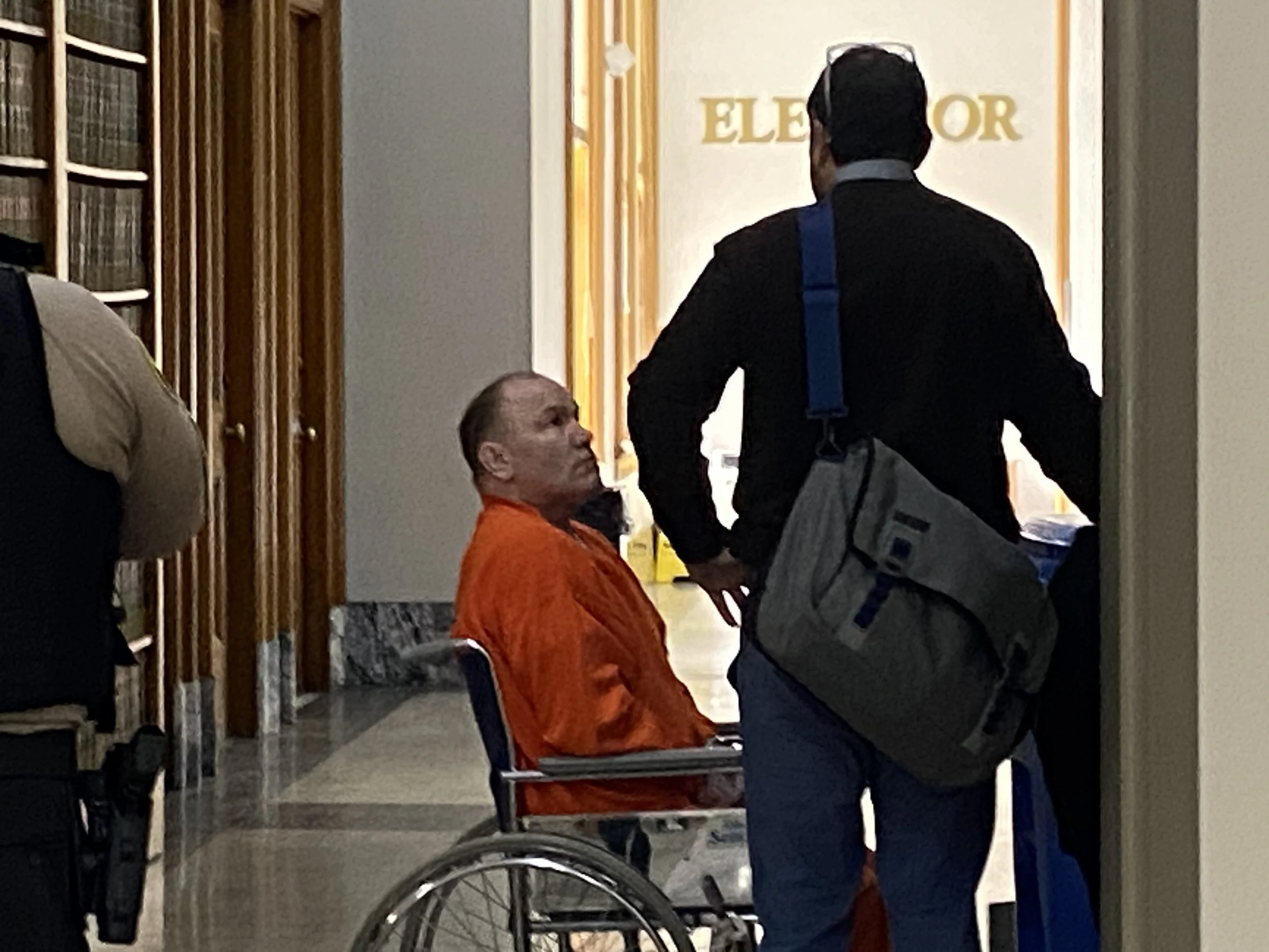 Jason McCollum, far right, on trial for the assault and robbery of Donald Lewis of The Dalles in 2021 leaves the courtroom on Tuesday, Jan. 27.