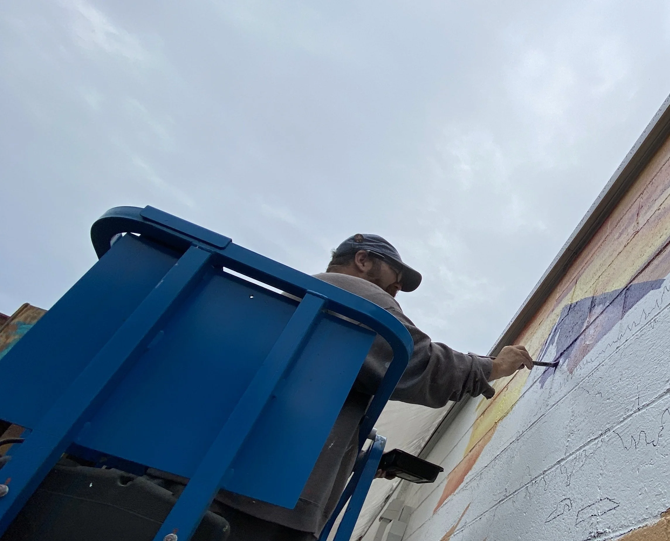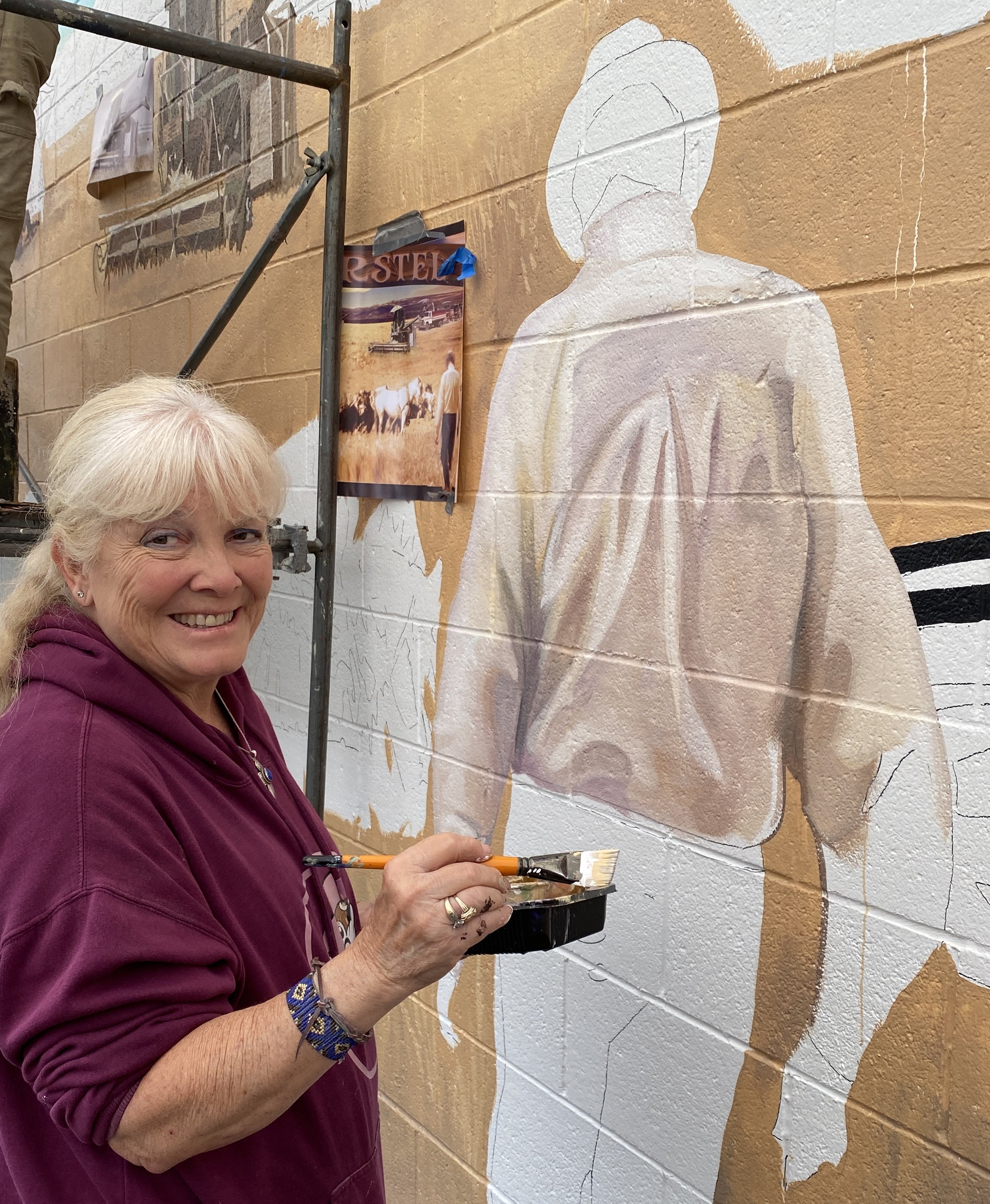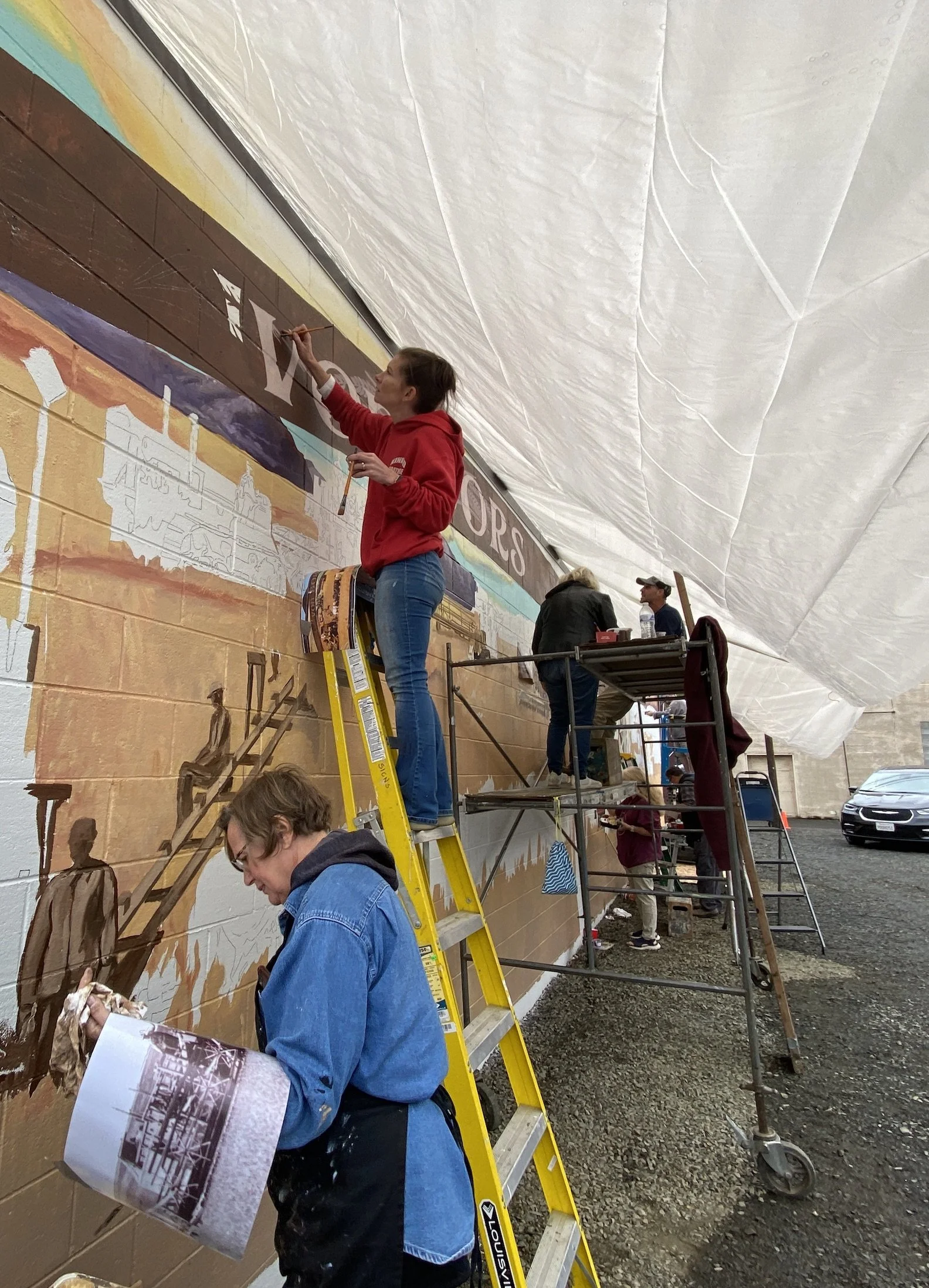 While helping other artists with paint colors and providing direction, Christine DeShazo of Murphysboro, Illinois, works on the back of Wayne von Borstel where he is depicted walking into the history of his family farm and ranch.
