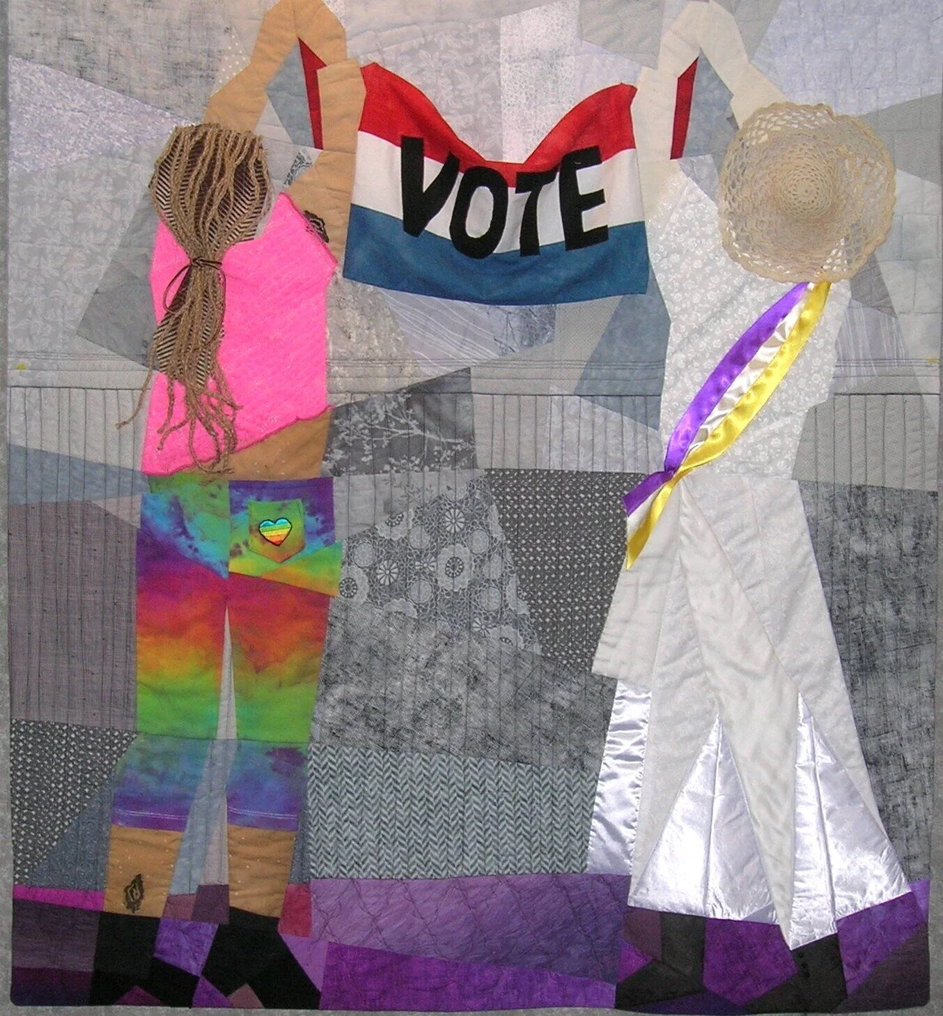 VOTE, girl you earned it! by Marbe Cook, of Hood River, OR won 1st place in the Viewers' Choice Awards in the Art Quilt “Journey” Challenge category. The challenge of the category is to create content that reflects the artist's interpretation or commemoration of the word ‘journey’.