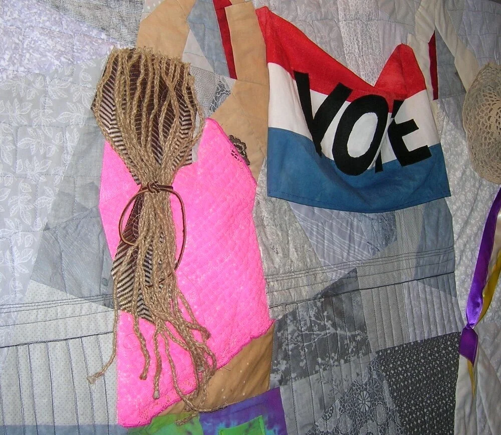 “It was fun to do. From the technical point of view of a quilter, it is an all-piece quilt. In the quilting world that means we sew the two pieces of fabric together and it’s not applique. And some of the materials that I used like the tie-dye pants on the 2020 voter came from the thrift shop. I had to cut up those pants to fit the pattern I had.