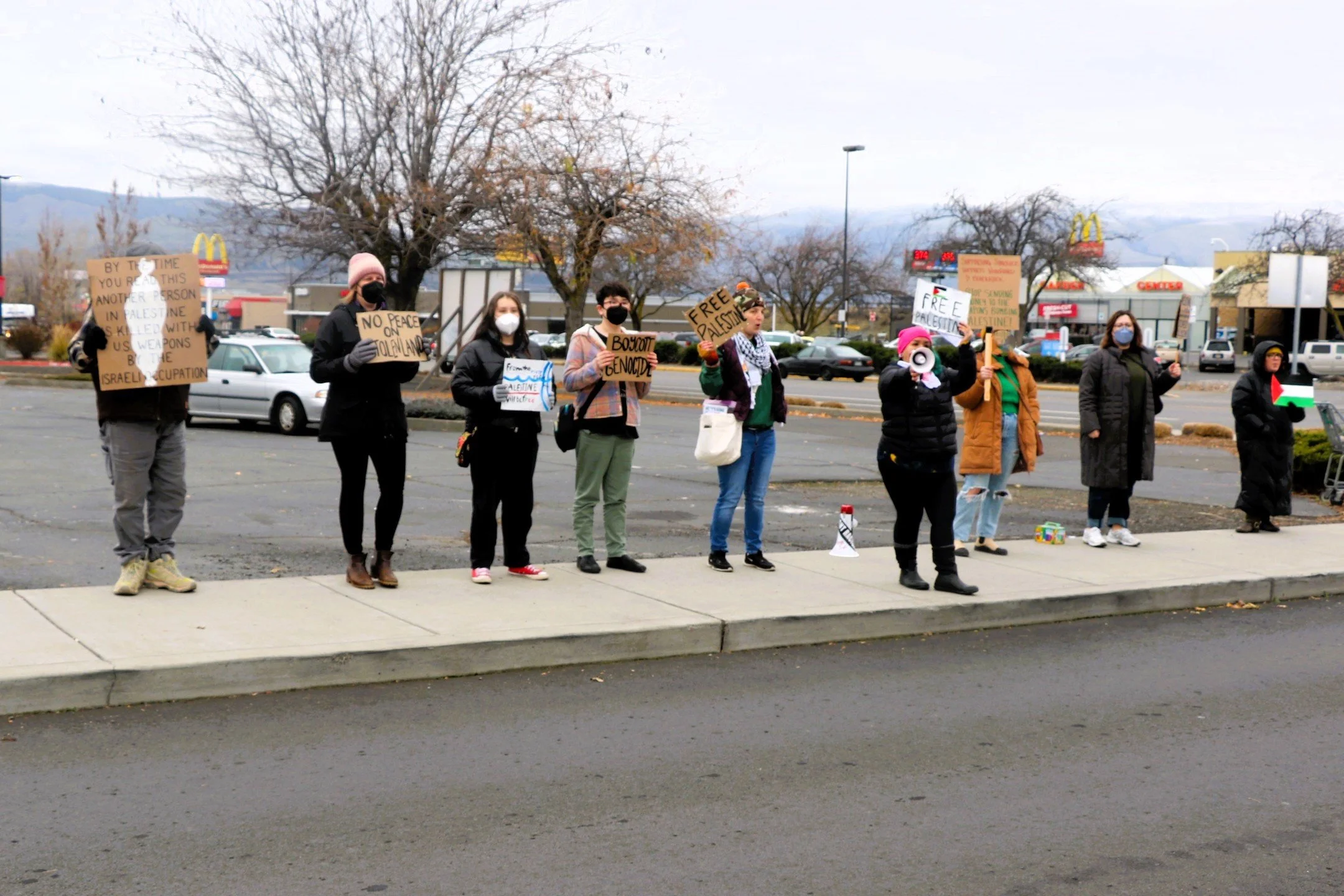 The Dalles, Ore., Dec. 8, 2023 - A small group of Pro-Palestine protesters gathered outside the Starbucks on 6th Street in The Dalles on Nov. 28, calling for a boycott of the corporation, claiming that it is funding the ongoing conflict between Israel and Hamas in Gaza in the Middle East.